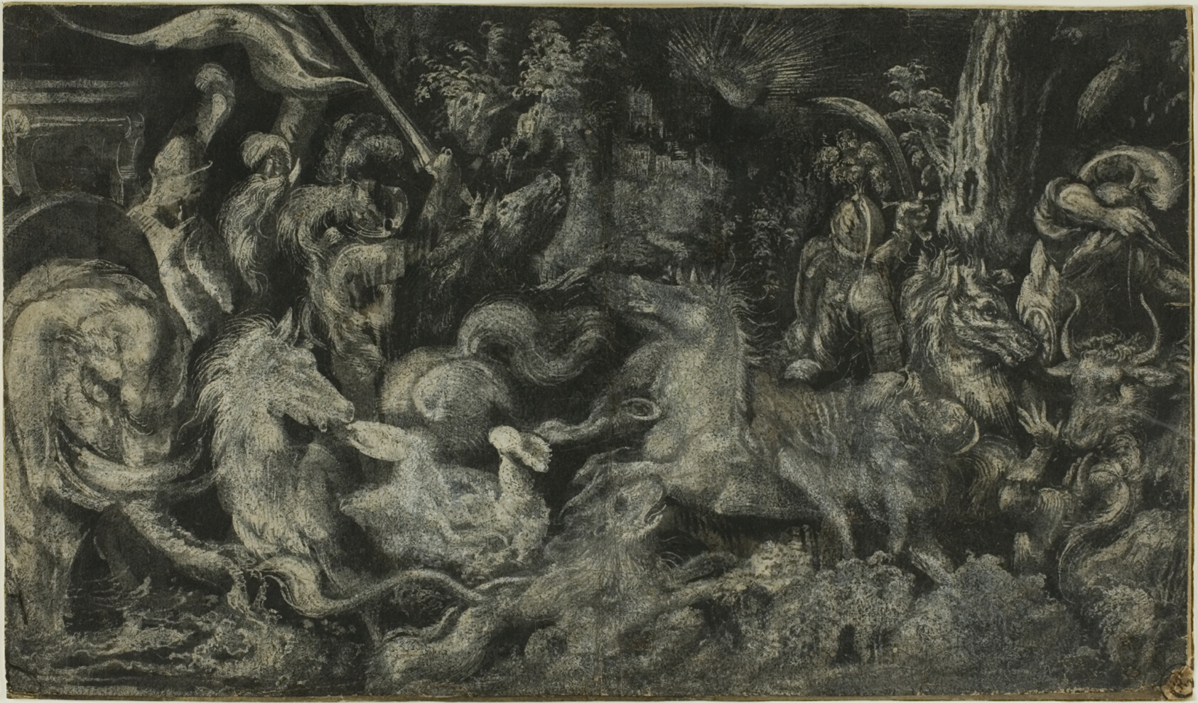- Brush and white gouache on cream laid paper prepared with a black wash, laid down onto a partial ivory laid paper mount