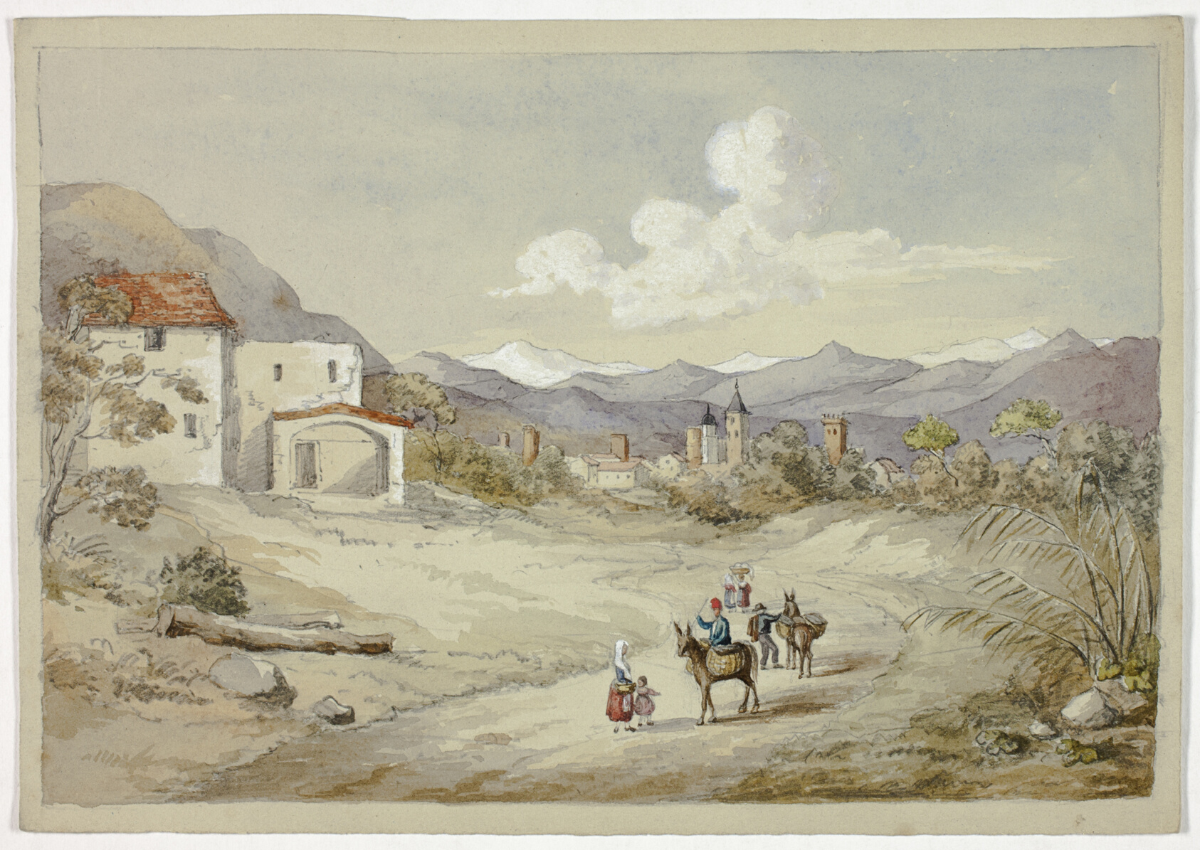 Painted on a November journey along the Italian Riviera, this intimate watercolor captures the sun-bleached calm of Albenga's coastline with the kind of immediacy that only firsthand observation produces. Elizabeth Murray was one of the relatively few professional women artists working in mid-nineteenth century Britain who built a career on travel and landscape. She worked extensively across the Mediterranean, developing a practice rooted in rapid, on-location sketching — using the texture of gray wove paper as a tonal foundation, then layering translucent watercolor washes and precise strokes of white gouache to suggest light falling on stone and sea. The result is less a composed studio piece than a record of a moment held still. Murray later published accounts of her years traveling and working abroad, and her paintings are now held in major institutional collections including the Art Institute of Chicago, where this work resides. The hand-painted oil reproduction translates Murray's delicate layering into a medium with greater physical presence — the luminosity of the original's washed skies and coastal light rendered in pigment that rewards close looking, faithful to the composition's quiet, unhurried character.