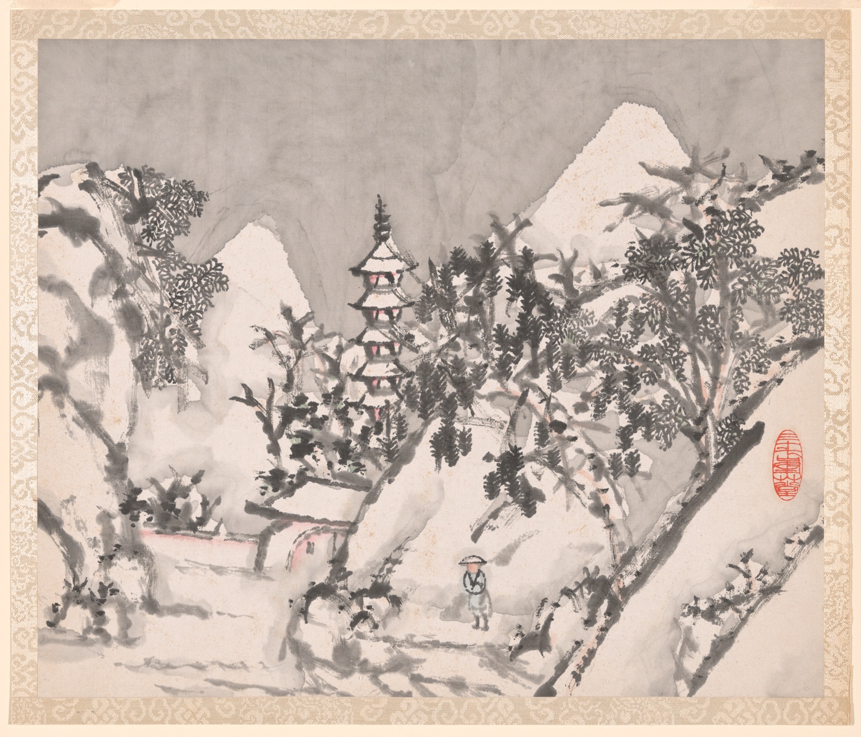 Created in the final years of Xugu's life, this album of landscapes and calligraphy stands as a quietly personal testament to one of the Qing dynasty's most distinctive painter-monks. Xugu — born Zhu Huairen, later ordained after the devastation of the Taiping Rebellion — developed a style that sat apart from the decorative excess fashionable in late-nineteenth-century Shanghai. His brushwork is spare and slightly trembling, full of deliberate irregularity: trees lean at odd angles, ink washes pool unevenly, negative space does as much work as the marks themselves. This album, gifted to the scholar Liu Songfu around 1895–96, weaves landscape leaves with passages of calligraphy, a format that treats painting and writing as a single unified act rather than separate arts. Xugu was reputedly so attached to the goldfish he kept in his studio that he refused to eat fish — a detail that speaks to the tender, attentive quality that runs through all his work, including these landscapes. The hand-painted oil reproduction translates Xugu's meditative brushwork into a richly textured surface, preserving the contemplative rhythm of the original while giving it the presence and depth of oil on canvas.