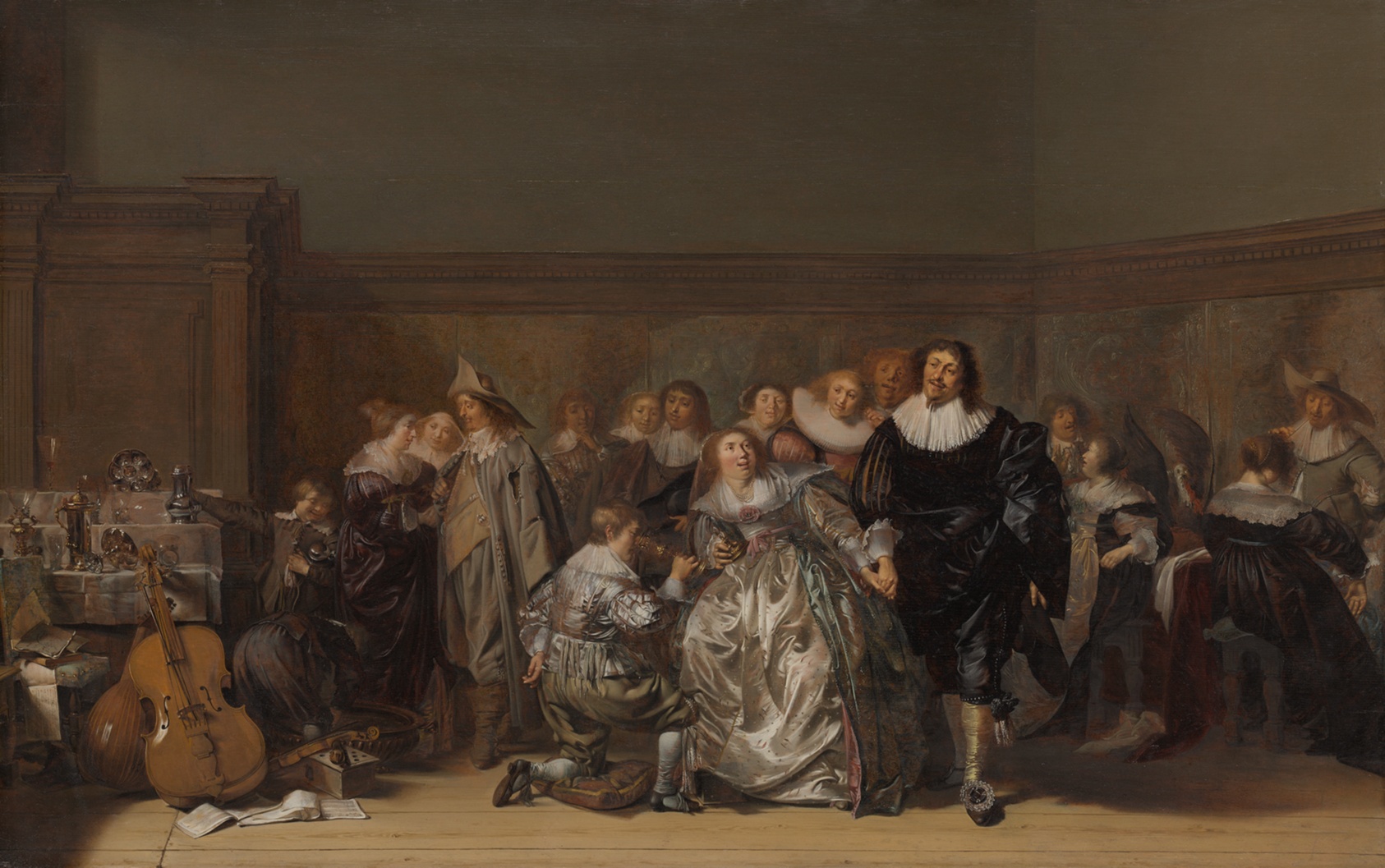 An Elegant Company draws you into the quietly pleasurable world of Dutch Golden Age leisure — candlelit figures in fine dress, gathered in easy conversation, music drifting between them. Pieter Codde was one of Amsterdam's most accomplished practitioners of the *gezelschapsportret*, the fashionable company scene that Dutch collectors prized for its blend of social aspiration and intimate atmosphere. He worked with a restrained palette and a gift for capturing the soft sheen of satin and the casual posture of people at ease, details that set his interiors apart from more theatrical contemporaries. His figures inhabit their surroundings naturally, never posed stiffly, which gives the composition a sense of genuine life caught mid-moment. Codde's reputation extended well beyond Amsterdam — he was chosen to complete Frans Hals's unfinished group portrait *The Meagre Company* in 1637, a commission that speaks to the esteem in which he was held by his peers. Our hand-painted oil reproduction on panel honours Codde's original materials and technique, with each layer of paint built up carefully to preserve the luminous depth and tonal subtlety that make this work so quietly compelling in person at the Art Institute of Chicago.