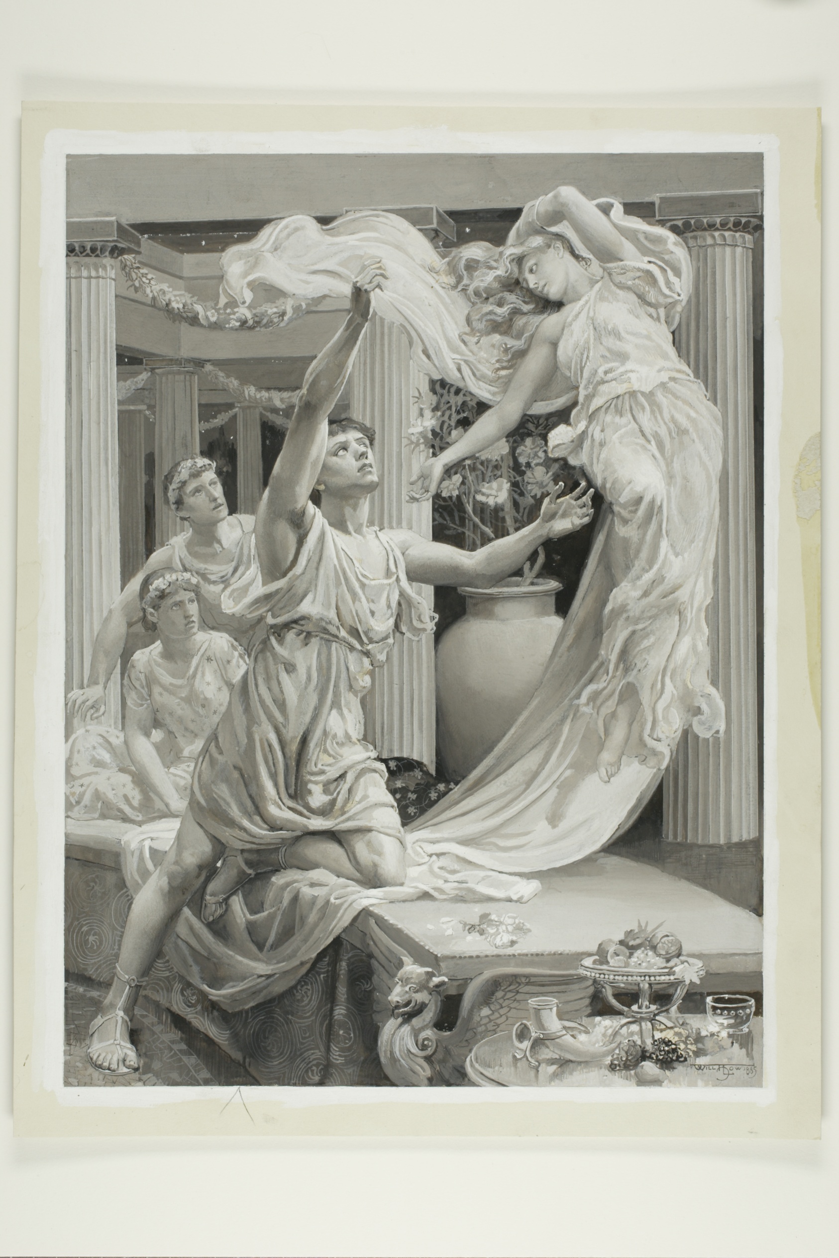 Rendered in delicate brown and white gouache on a warm cream board, this 1885 work by Will Hicock Low captures a moment of mythological grief with quiet, almost tender restraint. Low was a New York-born artist who trained in Paris under Jean-Léon Gérôme and became one of the more refined voices of the American Aesthetic Movement — a painter drawn to classical subjects, soft tonalities, and the mood of poetry rather than narrative drama. His gouache technique here gives the composition an intimate, sketch-like quality that feels closer to a private study than a public statement, which only sharpens its emotional weight. The title draws from John Keats' "Lamia," the moment when the enchantress vanishes and Lycius is left holding nothing — arms full of absence. Low had a well-documented affinity for Keats and the English Romantic poets, and several of his works from this period treat similar themes of beauty dissolving at the edge of reality. The original is held in the collection of the Art Institute of Chicago, where it remains a quiet highlight among the museum's nineteenth-century works on paper. This hand-painted oil reproduction translates Low's subtle tonal range and elegiac mood into a format made to last, bringing one of the Aesthetic Movement's most poignant small works into your home.