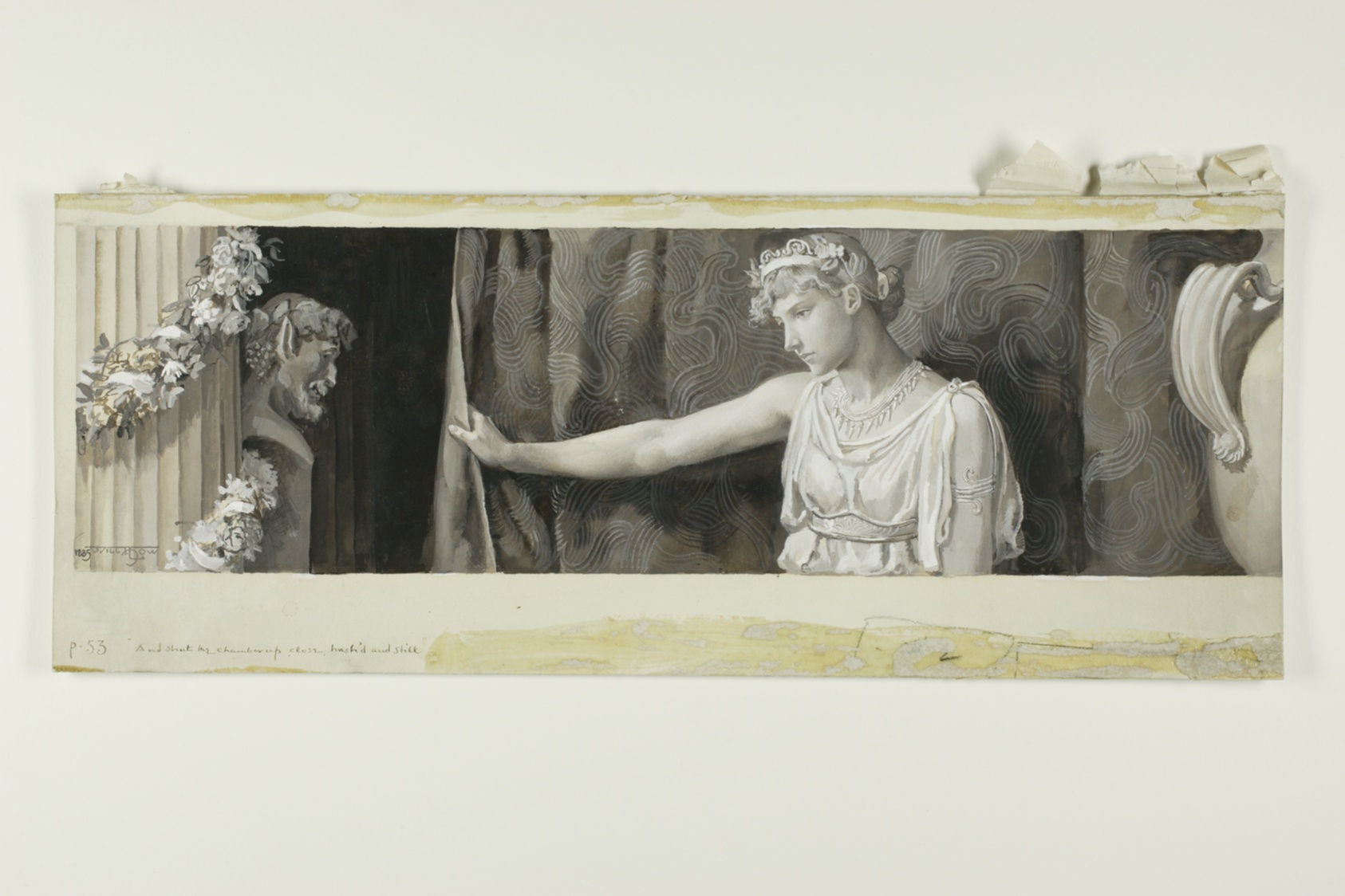 "And Shut the Chamber Up, Close, Hush'd and Still" is a work of deliberate restraint — a monochromatic meditation in black, grey, and white gouache on a warm cream board that seems, quite literally, to hold its breath. Will Hicock Low trained in Paris in the 1870s under Carolus-Duran, the same atelier that shaped John Singer Sargent, absorbing the French tradition's emphasis on tonal control and atmospheric precision. Where many American painters of his generation chased vibrancy through colour, Low was equally at home finding emotional weight through shadow and line alone. His career spanned fine art and illustration without apology, and this small-scale gouache shows how naturally those two worlds coexisted in his hands. The title is lifted from Keats' "The Eve of St. Agnes," a poem Low returned to across his career — drawn, it seems, to its imagery of secrecy and hushed longing, which suited his instinct for quiet, interior feeling. The Art Institute of Chicago holds the original, a piece that rewards close looking precisely because it asks so little of you at first glance. Our hand-painted oil reproduction honours that hush, translating Low's spare gouache tones into the warmer, more dimensional language of oil on canvas while preserving the sense of a room with the door softly closed.