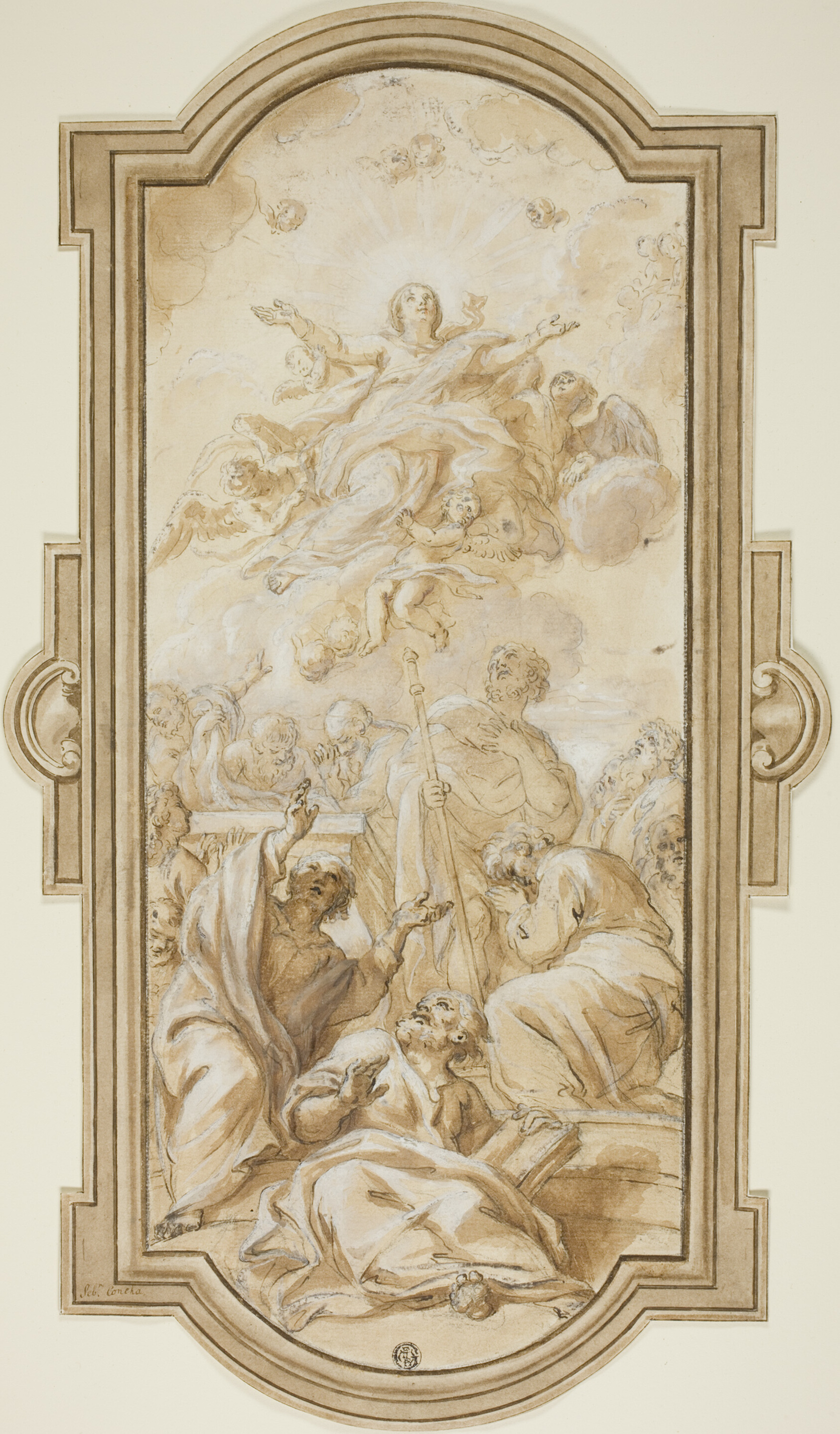 Calandrucci's *Assumption of the Virgin* is a study in controlled devotion — figures ascending through soft luminous space, the composition pulling the eye upward with a graceful, unhurried authority. Giacinto Calandrucci was born in Palermo in 1646 and spent the formative years of his career in Rome as one of Carlo Maratti's most gifted pupils, absorbing the classical restraint and delicate figural elegance that defined late Baroque Roman painting. This work, executed around 1703 near the end of his life, demonstrates his command of preparatory draughtsmanship: pen and brown ink layered with wash and white gouache over black chalk, building depth and luminosity through accumulated marks rather than colour. The result reads more like a finished devotional piece than a working study. Calandrucci was so closely associated with Maratti's manner that contemporaries often struggled to distinguish their hands — a testament to how thoroughly he had absorbed his master's approach to sacred subjects. Our hand-painted oil reproduction translates that delicate tonal language — the warm browns, the lifted whites, the soft architectural forms emerging from shadow — into the richness and texture of oil on canvas, bringing the intimacy of the original drawing into a format made for walls and lasting ownership.