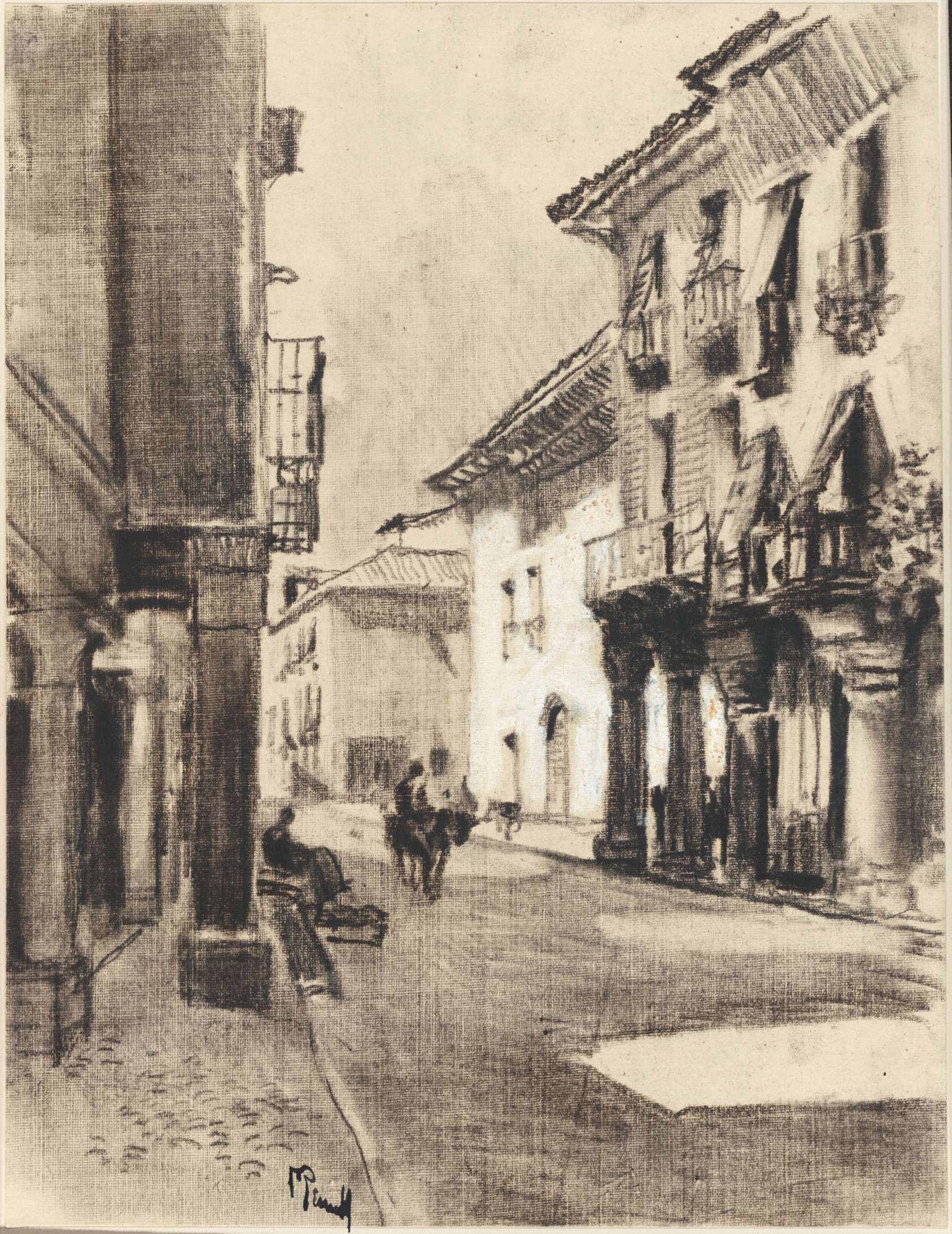 Pennell's view of Alcalá's main street carries the unhurried weight of a Spanish afternoon, its architecture dissolving into atmosphere through masterful tonal gradation. Joseph Pennell was among the most celebrated American illustrators of his era, a relentless traveller who documented the architecture and street life of Europe with an etcher's precision and a painter's eye for mood. Working here in litho crayon on cream transfer paper, he built up shadow and texture through layered smudging before lifting highlights back into the scene with white gouache — a process that gives the work its characteristic sense of haze and depth, somewhere between drawing and print. The result feels less like a record of a place than a memory of one. Pennell spent considerable time in Spain during the early 1900s, and the Castilian series reflects his sustained engagement with the region's distinctive light and its slow, sun-bleached streets — qualities that resist the quick sketch and reward patient observation. The hand-painted oil reproduction translates all of this into a medium with its own richness: the gouache highlights become luminous impasto, the tonal smudging becomes layered glaze, and the warm cream ground of the original finds its equivalent in the canvas beneath — a faithful reinterpretation rather than a copy.