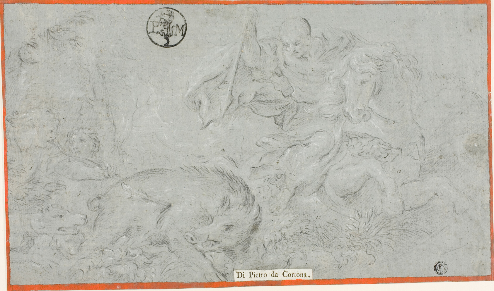 - Black chalk, heightened with white chalk, with pen and brown ink and brush and red gouache, on blue-gray ground, on ivory laid paper