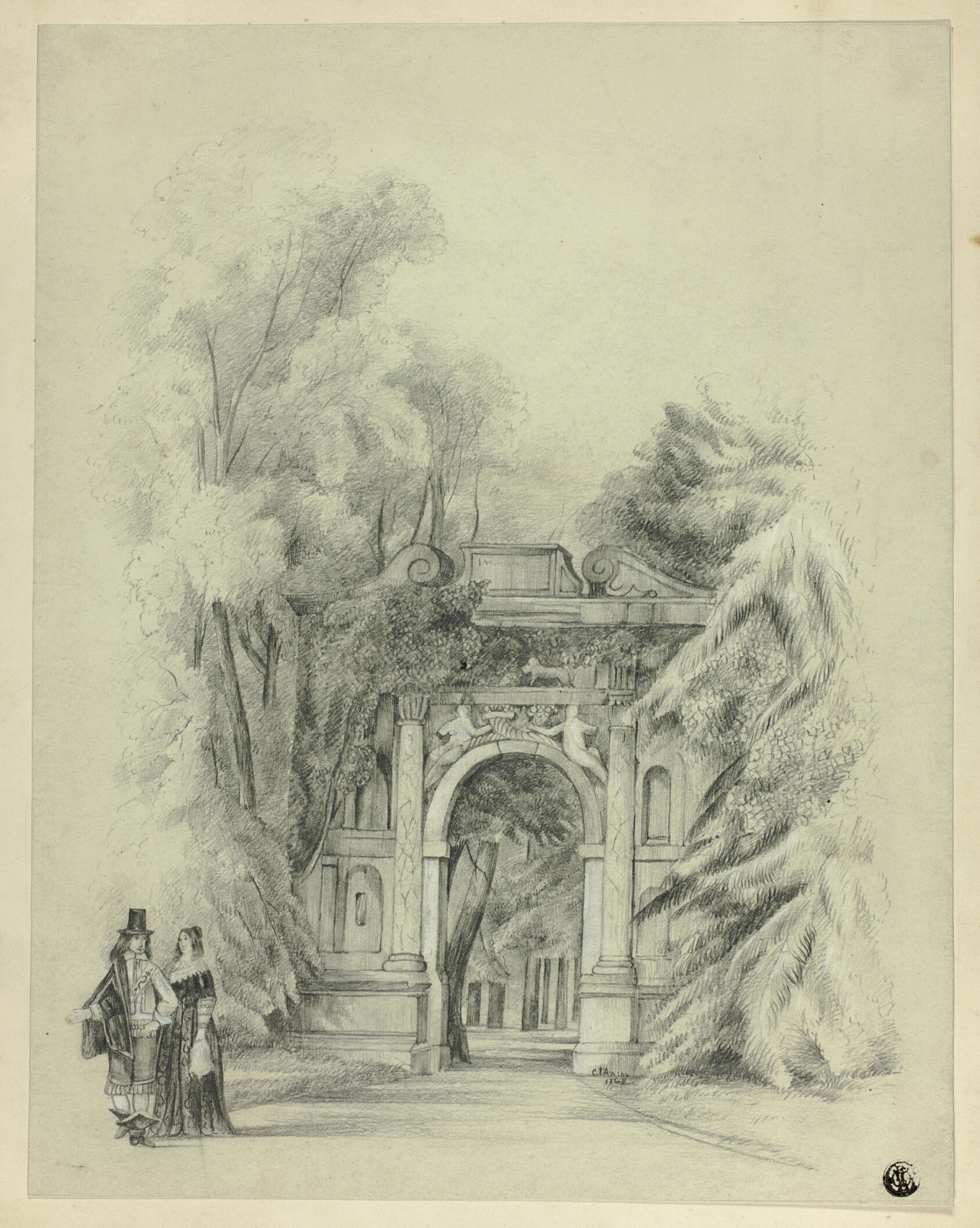 Delicate yet stately, this 1864 drawing captures a couple dressed in the fashions of two centuries prior, paused at the threshold of a park with an air of quiet ceremony. Charles de Anson worked in a disciplined academic tradition, and this piece demonstrates his mastery of the heightened drawing technique — graphite lines establishing form and shadow, then white gouache lifted across the surface to describe light on fabric, lace, and foliage. The choice of pale green wove paper was deliberate: the mid-tone ground allowed him to work in both directions simultaneously, darkening into shadow and brightening toward highlight without layering unnecessary pigment. The result has the controlled elegance of a preparatory study elevated to finished work. The piece is held in the permanent collection of the Art Institute of Chicago, which acquired it as part of its holdings in European works on paper. Because the original is a drawing rather than a painting, translating it to oil on canvas is itself an interpretive act — one that honours the tonal restraint of Anson's technique while giving the image the physical depth and presence that only paint can provide. Each hand-painted reproduction is built up from careful observation of the original, preserving the balance of light and shadow that makes this work quietly arresting.