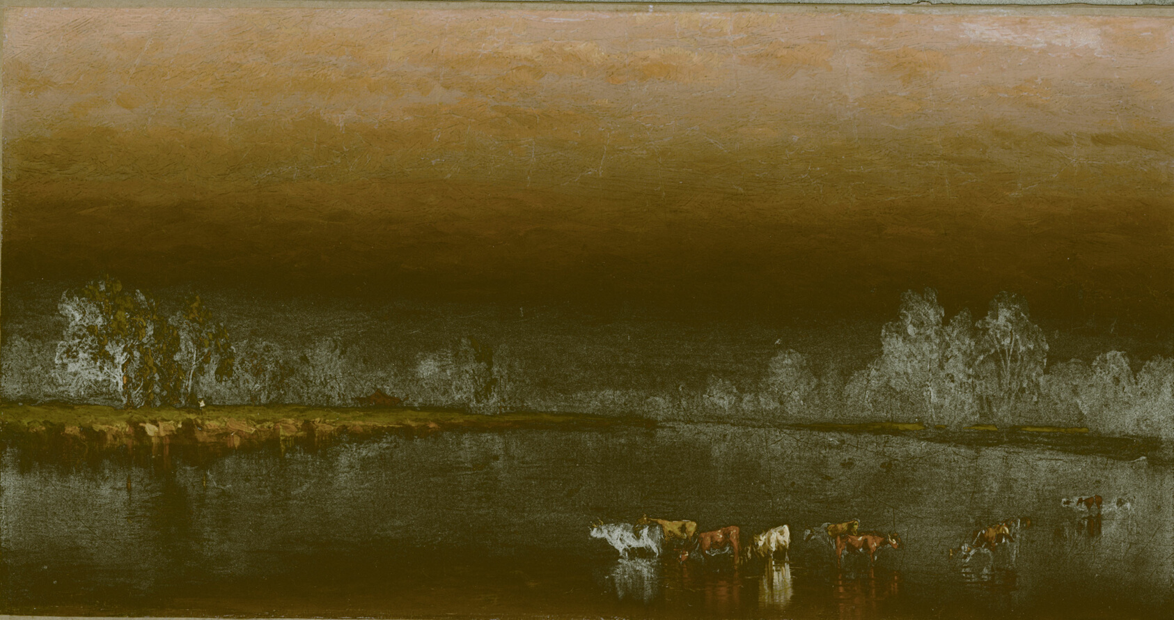 Cows in a Pond at Sunset is one of the quieter masterworks of American Luminism — a painting that holds an entire evening in its stillness. Sanford Robinson Gifford was among the most gifted of the Hudson River School painters, though his sensibility ran closer to the Luminist tradition than to dramatic wilderness spectacle. Where contemporaries reached for grandeur, Gifford reached for atmosphere. His signature technique involved building up thin, translucent glazes of paint to create a warm, suffused haze — light that seems to come from within the canvas rather than fall upon it. This 1860 work is a precise example of that gift: the pond mirrors a dissolving sky, and the cattle stand half in shadow, half in the last copper of the day. Gifford served in the New York National Guard during the Civil War and continued painting throughout, finding in landscape a kind of sustained meditation that ran counter to the violence of the period. Our hand-painted oil reproduction is made to order on canvas, following Gifford's layered glazing approach so that the luminous warmth of the original — that sense of light held just before it fades — is faithfully present in every piece.