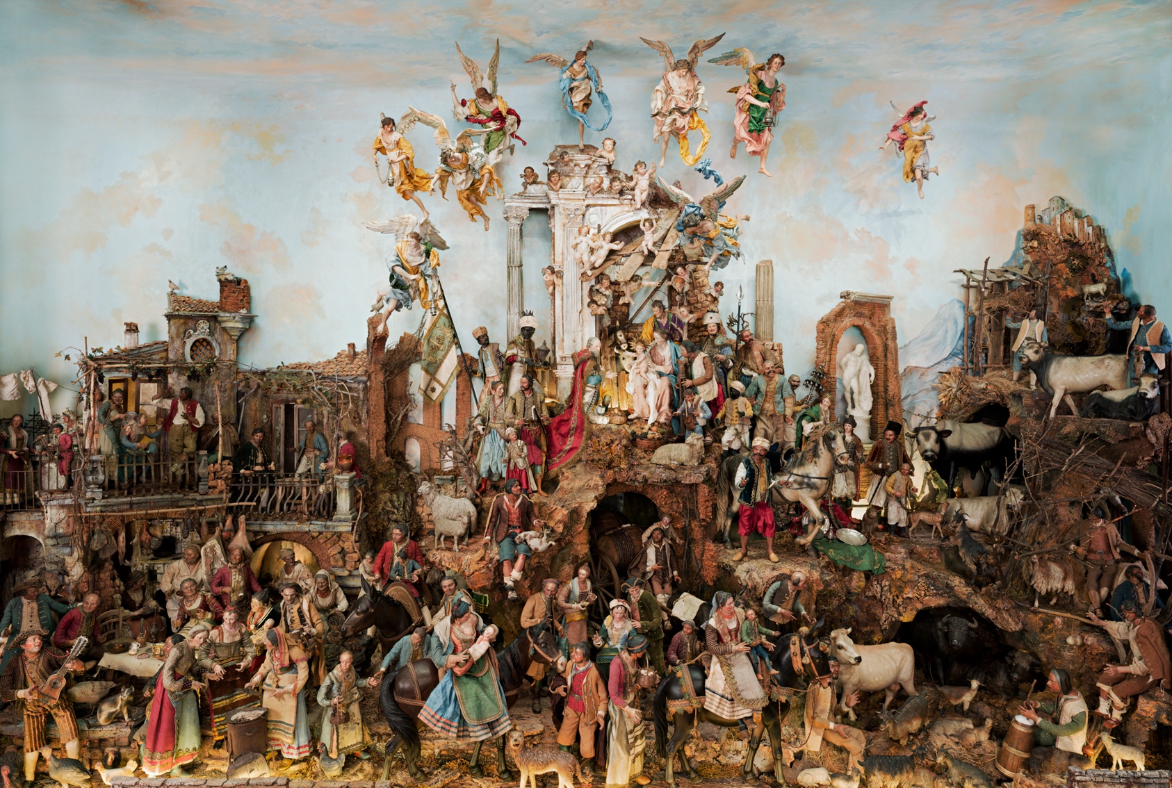Few works capture the warmth and theatricality of the Nativity tradition quite like this elaborate Neapolitan crèche, a densely layered scene that draws the eye into a world of intimate religious devotion. Neapolitan presepi — nativity scenes — reached their artistic peak in the eighteenth century, when the craft was elevated from folk tradition to high art under the patronage of the Bourbon court. This example typifies the ambition of the form: figures modelled in terracotta with articulated limbs dressed in real cloth, set against landscapes built from cork, moss, and papier-mâché. The deliberate mixing of materials — wax, metal, straw, watercolour, gouache — creates a tactile richness that no single medium could achieve alone. The Art Institute's crèche is among the finest surviving examples of the form in North America, its "later additions" reflecting the living tradition of crèche-building, where scenes were often expanded and embellished across generations. Our hand-painted oil reproduction translates this multi-media marvel onto canvas, preserving the warm ochres, deep shadows, and fine figural detail that make the original so arresting, and bringing the spirit of eighteenth-century Naples into any home.