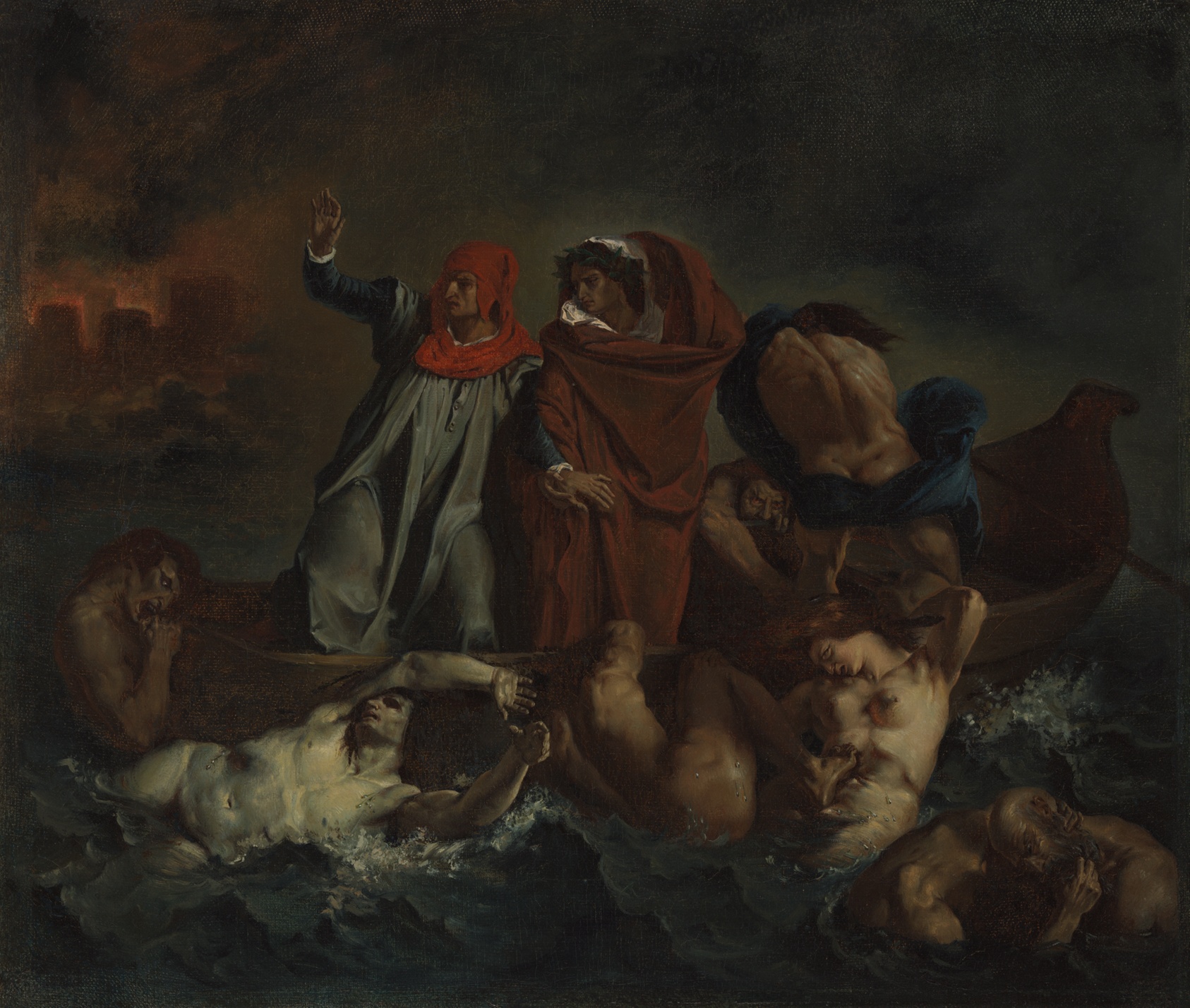 Few works in the Romantic tradition convey turbulence with such raw physicality — writhing figures, churning water, and a sky pressing down like a bruise. Eugène Delacroix completed the original *Barque of Dante* in 1822 as his first major Salon submission, and it announced him immediately as the defining voice of French Romanticism. Where his Neoclassical contemporaries prized cool restraint, Delacroix favoured collision — of colour, of flesh, of light against darkness. His brushwork is muscular and unresolved in the best sense, leaving the surface alive with tension. The painting's debt to Rubens and Michelangelo is visible in every straining limb, yet the emotional temperature is entirely Delacroix's own. Period copies of the composition circulated widely in the mid-nineteenth century, a mark of how seriously the work was taken by contemporaries; the Art Institute of Chicago holds one such canvas, painted by an unknown hand working closely from the original. This hand-painted oil reproduction is made using traditional pigments on canvas, following the tonal drama and loose bravura of the source. Every gradation of storm-light and every figure clinging to the bark is rendered by hand, giving you a painting with genuine presence rather than a print dressed up as one.
