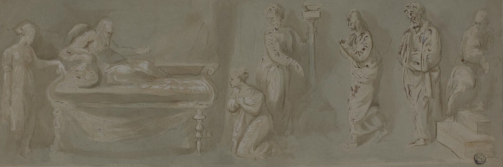 - Brush and brown ink, with green and brown wash, heightened with white gouache, over graphite, on grayish green wove paper