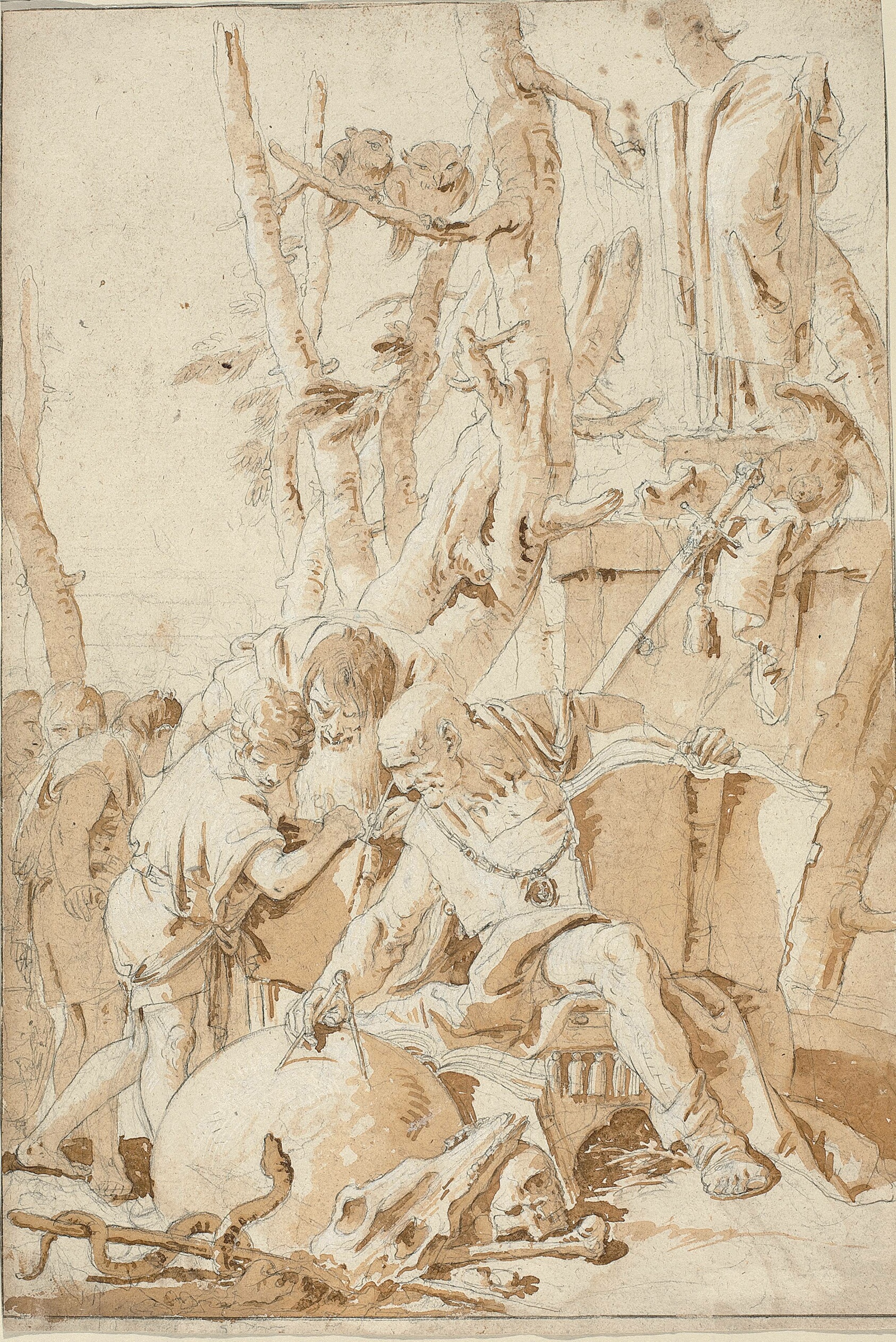 - Black chalk, with pen and black and brown ink and brush and various brown washes, heightened with white gouache, on cream laid paper
