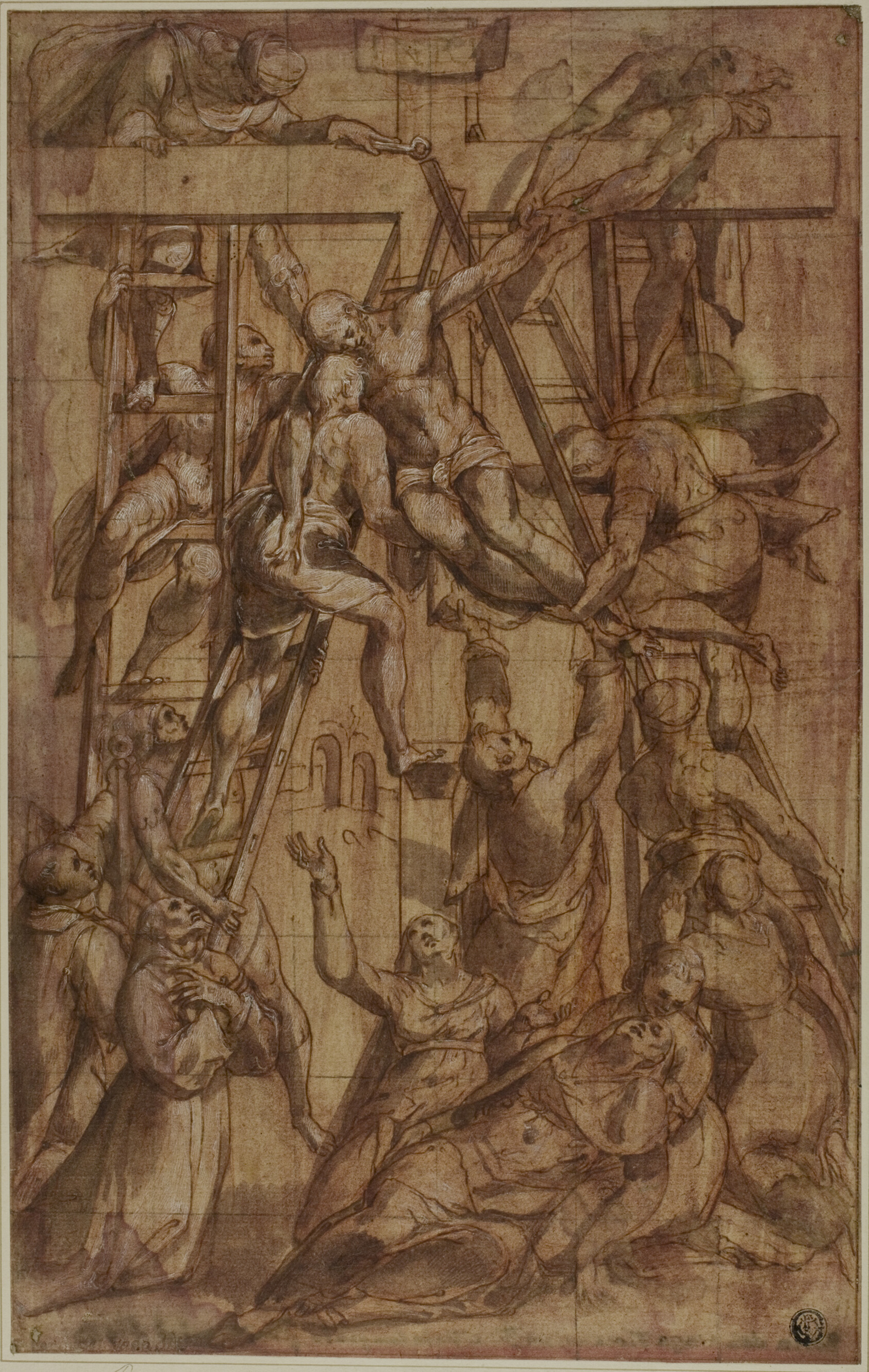 This preparatory drawing by Simone de Magistris pulls you into one of devotional art's most charged moments — the lowering of Christ's body from the cross — with an intimacy that monumental altarpieces rarely achieve. De Magistris was a central Italian Mannerist working primarily in the Marche and Umbria regions, and this sheet shows him at his most considered. The layered technique — pen and ink beneath washes of brown and red, lifted with white gouache — gives the figures a sculptural weight unusual for works on paper. The presence of Saint Francis grounds the scene in Franciscan spirituality, which dominated the devotional commissions of the region in this period. The grid of black chalk squares covering the sheet is not accidental damage but deliberate method: artists used this squaring technique to transfer a composition accurately to a larger canvas or panel, confirming this drawing was a genuine working document in the creation of a finished altarpiece. Our hand-painted oil reproduction translates the luminous warmth of those original washes into the depth and permanence of oil on canvas, preserving every expressive line and devotional intensity that de Magistris committed to paper nearly five centuries ago.
