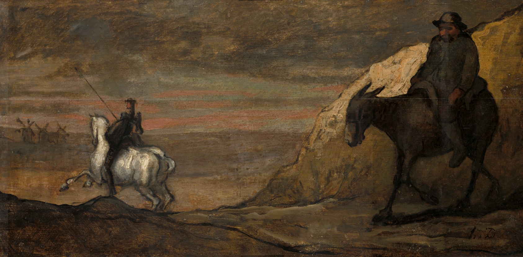 This brooding panel painting captures Don Quixote mid-charge, his lance levelled at the looming windmills, the landscape dissolving into dark, atmospheric paint that feels closer to a dream than a field in La Mancha. Honoré Daumier was captivated by Cervantes' knight-errant for decades, returning to the subject again and again across paintings, drawings, and sculptures. The artist behind this panel worked firmly within that tradition, adopting Daumier's characteristic loose, gestural brushwork and compressed tonal range — ochres and umbers giving way to near-black shadows, with the gaunt figure of Quixote emerging almost sculpturally from the ground. The panel support lends the paint surface a particular density and warmth that canvas rarely achieves. Daumier himself is widely understood to have identified personally with Don Quixote — a visionary ignored or mocked by the world around him — and that quiet empathy runs through every version of the subject produced within his circle. Our hand-painted oil reproduction is executed on panel with the same layered technique as the original, preserving the tonal drama, gestural freedom, and melancholic charge that have made this image so enduring. It is painted entirely by hand, one brushstroke at a time, with no digital or print processes involved.