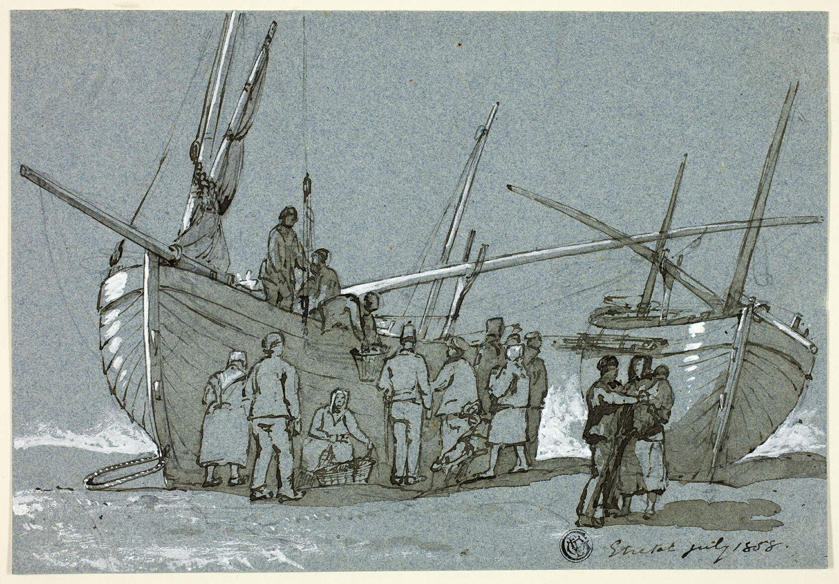 - Pen and brown ink, with brush and brown wash and white gouache, over traces of graphite, on blue wove paper