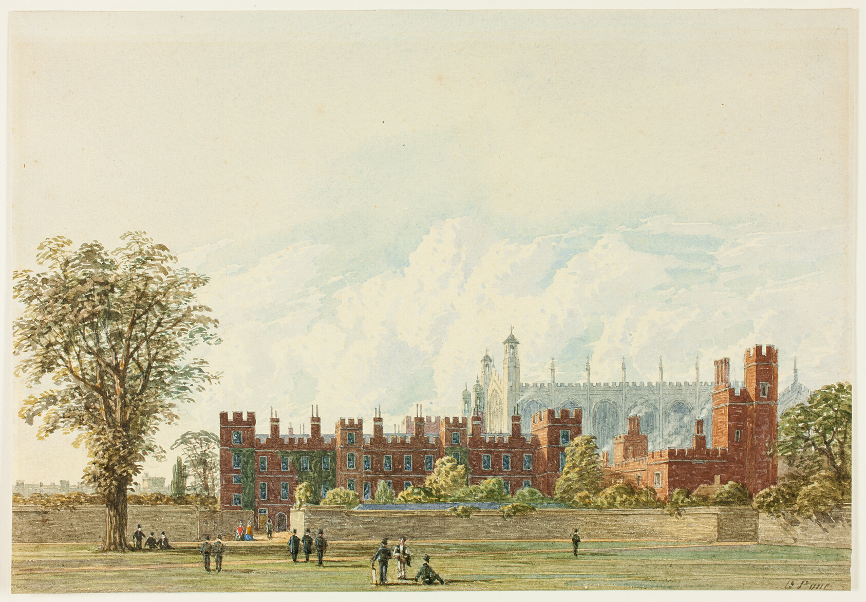 Pyne's quiet view across Eton's playing fields carries the unhurried atmosphere of a summer afternoon in Victorian England, the college's Gothic towers rising softly against a luminous sky. George Pyne (1800–1884) was a respected English watercolorist and drawing master whose work gravitated toward architectural and topographical subjects — collegiate buildings, cathedral closes, the genteel countryside. Here he works with his characteristic restraint, laying down graphite underdrawing before building washes of colour, then using touches of white gouache to lift highlights on stonework and cloud edges. The result has a delicate luminosity that pure watercolour alone rarely achieves. The view itself carries cultural weight beyond aesthetics. The playing fields of Eton became one of the most quoted landscapes in British life following the Duke of Wellington's much-repeated remark — accurate or not — that the Battle of Waterloo was won there, and Pyne captures exactly the kind of open, unhurried ground that inspired the legend. Our reproduction translates this work into hand-painted oils on canvas, preserving the tonal subtlety and architectural precision of the original while giving the image a presence and permanence suited to wall display. Each piece is painted to order by a trained artist working directly from the Art Institute of Chicago's archival source.