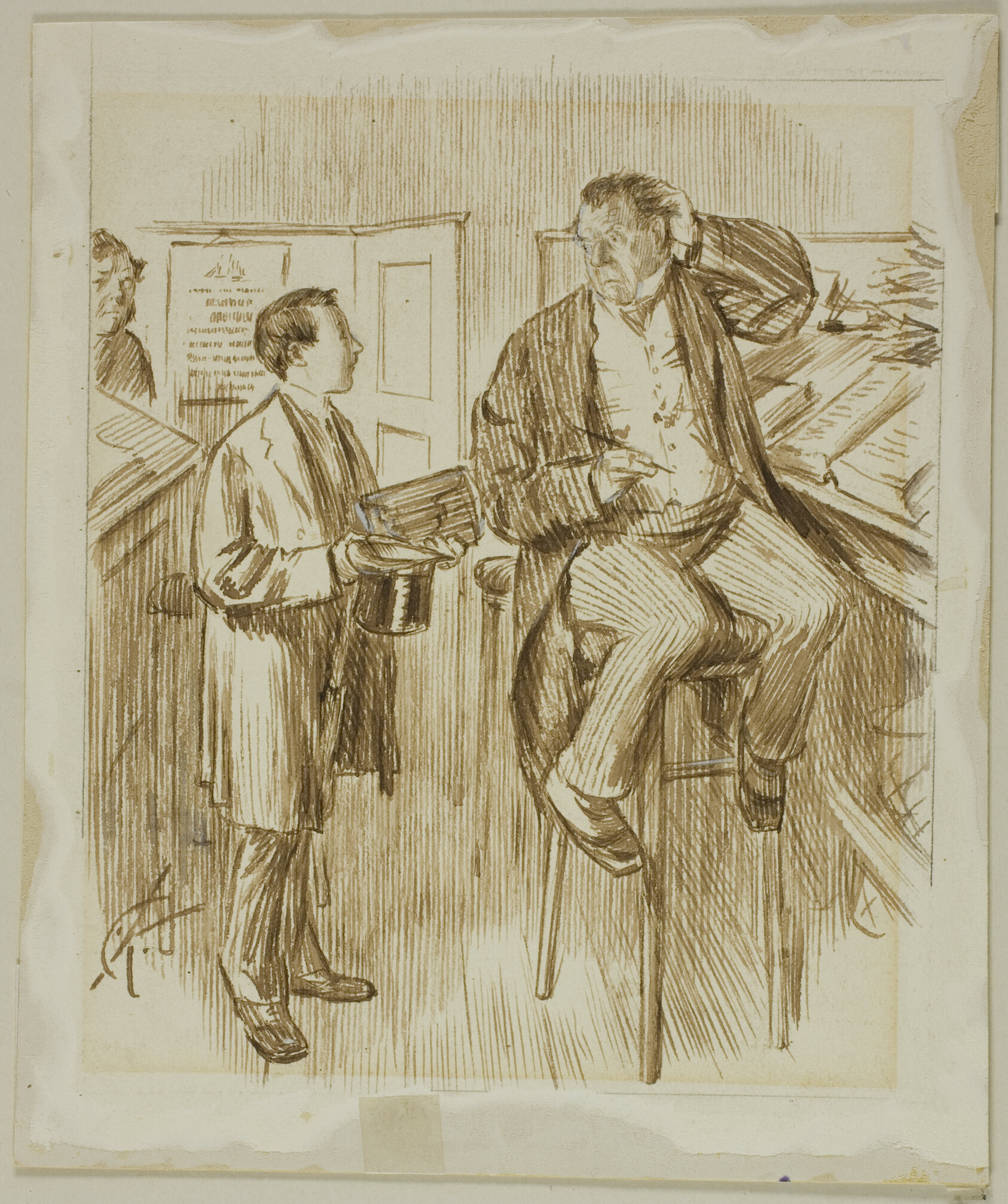"For the Third Time of Asking" captures the dry wit and observational precision that defined Charles Samuel Keene's portrait of Victorian everyday life — a fleeting social exchange rendered with extraordinary economy of line and a knowing sense of timing. Keene spent nearly four decades as one of Punch magazine's most distinctive illustrators, developing a style rooted in meticulous draughtsmanship and an acute eye for character. Working primarily in pen and ink, he built texture and depth through dense hatching, and this piece shows that mastery fully realised — the brown wash and delicate white gouache adding warmth and atmosphere to what might otherwise be a purely graphic exercise. His figures carry a lived-in authenticity that sets him apart sharply from more sentimental contemporaries. Edgar Degas, not a man given to easy praise, was an outspoken admirer of Keene's work, reportedly acquiring examples of his drawings and citing him as a direct influence on his own approach to figure drawing. Our hand-painted oil reproduction translates this intimate, intricately linear work into a medium that honours its tonal richness and quiet humanity — bringing the mood and careful observation of the original to life with the warmth and permanence that only oil on canvas can provide.