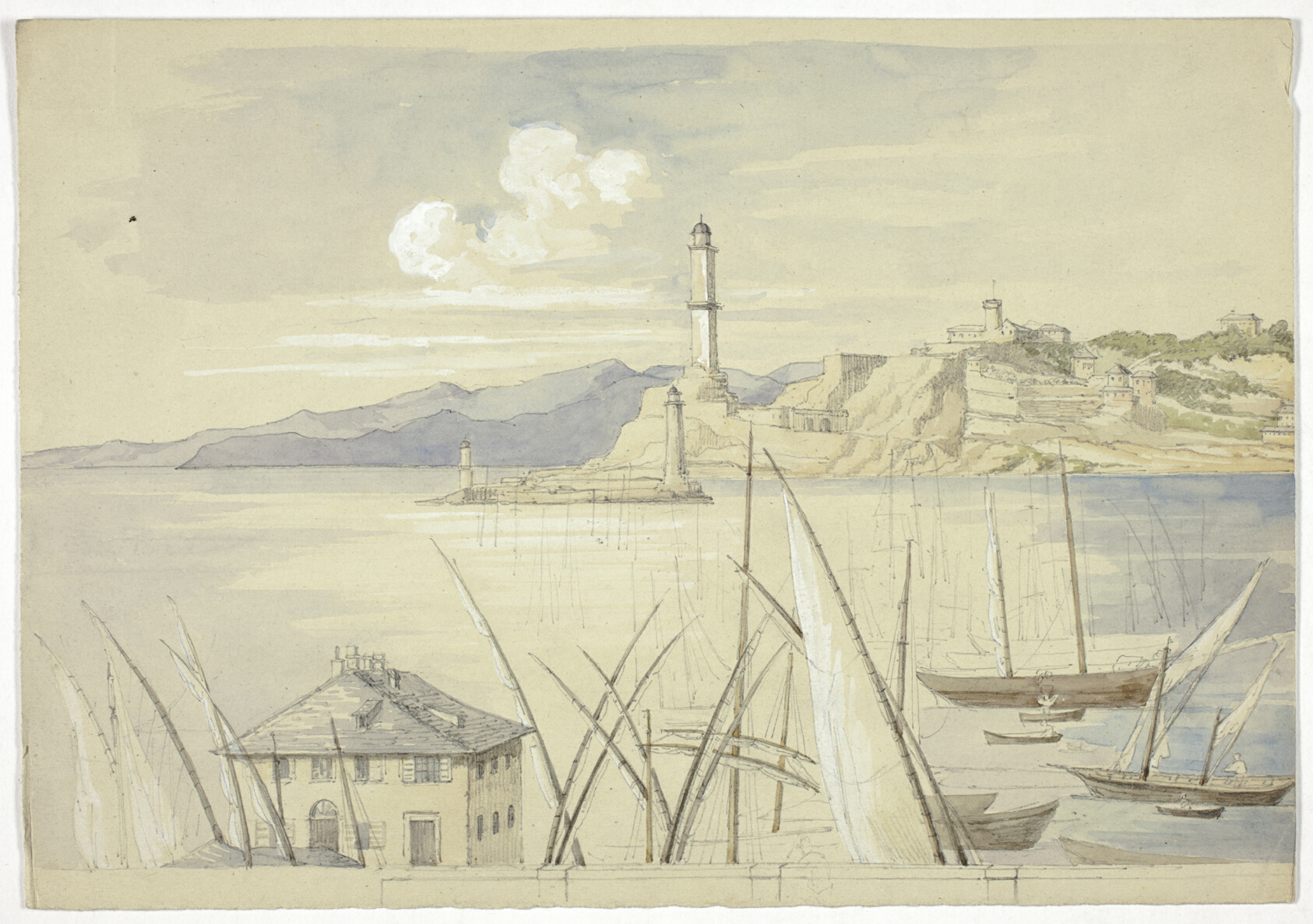 Painted from a hilltop vantage above Genoa's layered rooftops and harbor, this 1841 work captures the city at a moment when British artists were drawn to the Mediterranean coast with the same urgency as the Grand Tourists who preceded them. Elizabeth Murray was a British watercolorist who spent years traveling and working in southern Europe and North Africa, developing a practice rooted in direct observation rather than studio reconstruction. Here she works in watercolor and white gouache over a graphite underdrawing on gray paper — a combination that gives her light a particular cool luminosity, the gouache lifting highlights from the mid-toned ground rather than building them up from white. The gray paper itself does much of the atmospheric work, unifying the composition without flattening it. Murray documented her years abroad in the memoir *Sixteen Years of an Artist's Life in Morocco, Spain, and the Canary Islands*, published in 1859, which speaks to how seriously she took the role of witness as much as artist. This hand-painted oil reproduction translates Murray's quiet precision into the richer physical texture of oil on canvas, preserving the depth of the original panorama while giving the work a lasting presence suited to display.