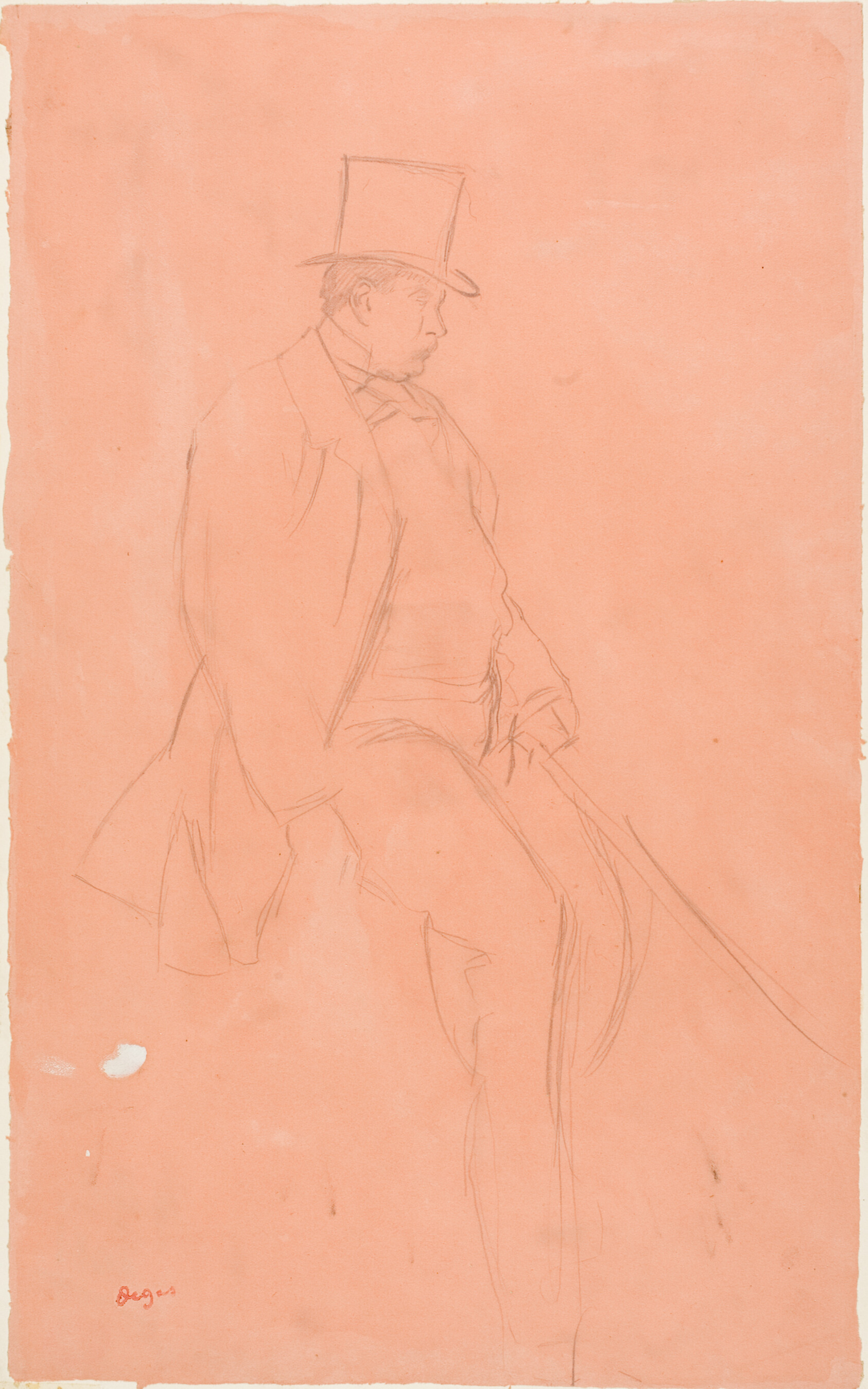 Drawn with a sculptor's eye for weight and stance, Degas's *Gentleman Rider* distils a horse and rider into a few charged graphite lines on blush-pink paper — spare, confident, and alive with implied motion. Degas returned to equestrian subjects throughout his career, finding in the racecourse the same qualities he pursued in ballet studios: bodies caught mid-effort, form defined by function. Here he works in graphite with touches of white gouache, using the warm tone of the paper itself as a middle value — a technique that gives the figure a luminous, three-dimensional quality without a single passage of conventional shading. The drawing dates from a period when Degas was a regular visitor to the Hippodrome de Longchamp, filling sketchbooks with studies of jockeys and thoroughbreds that would feed decades of finished work. He famously studied horses with the rigour of a naturalist, yet his results always read as feeling rather than anatomy. The hand-painted oil reproduction translates the quiet authority of the original into a format that carries in a room — the economy of the composition preserved, the gestural confidence of Degas's line honoured in every brushstroke.