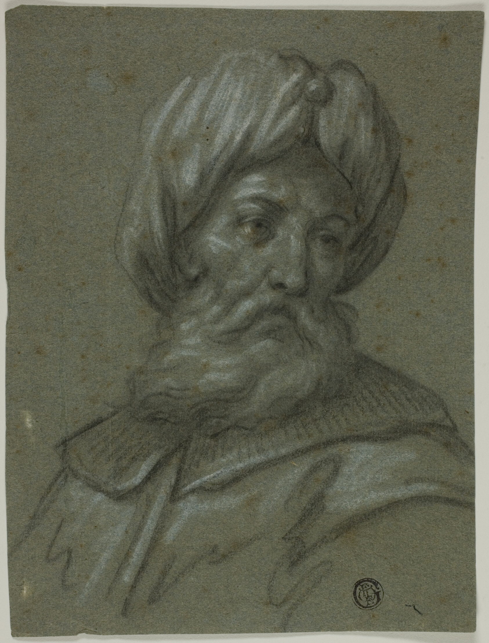 This intimate character study captures an elderly man's weathered dignity with a stillness that feels almost contemplative, the kind of face that invites you to imagine a whole life behind it. Created by an as-yet unidentified hand, the work belongs to a tradition of academic figure studies that flourished across European ateliers from the sixteenth century onward, where depictions of turbaned elders served as both technical exercises and explorations of character. The artist demonstrates considerable sophistication in the medium: charcoal is blended through stumping to produce smooth tonal gradations across the face and beard, while strategic touches of white gouache lift the highlights on the brow, turban folds, and whiskers, giving the figure a subtle luminosity against the original blue-green laid paper. That distinctive ground colour — neither neutral nor assertive — unifies the composition in a way that a white sheet never could. Works of this type held at the Art Institute of Chicago are regularly studied by scholars attempting to assign attribution to regional schools, and the piece remains a compelling open question in that ongoing conversation. The hand-painted oil reproduction translates these quiet strengths faithfully — the layered tonal depth, the softness of the beard, the dignified weight of that gaze — rendered in a medium built to last.