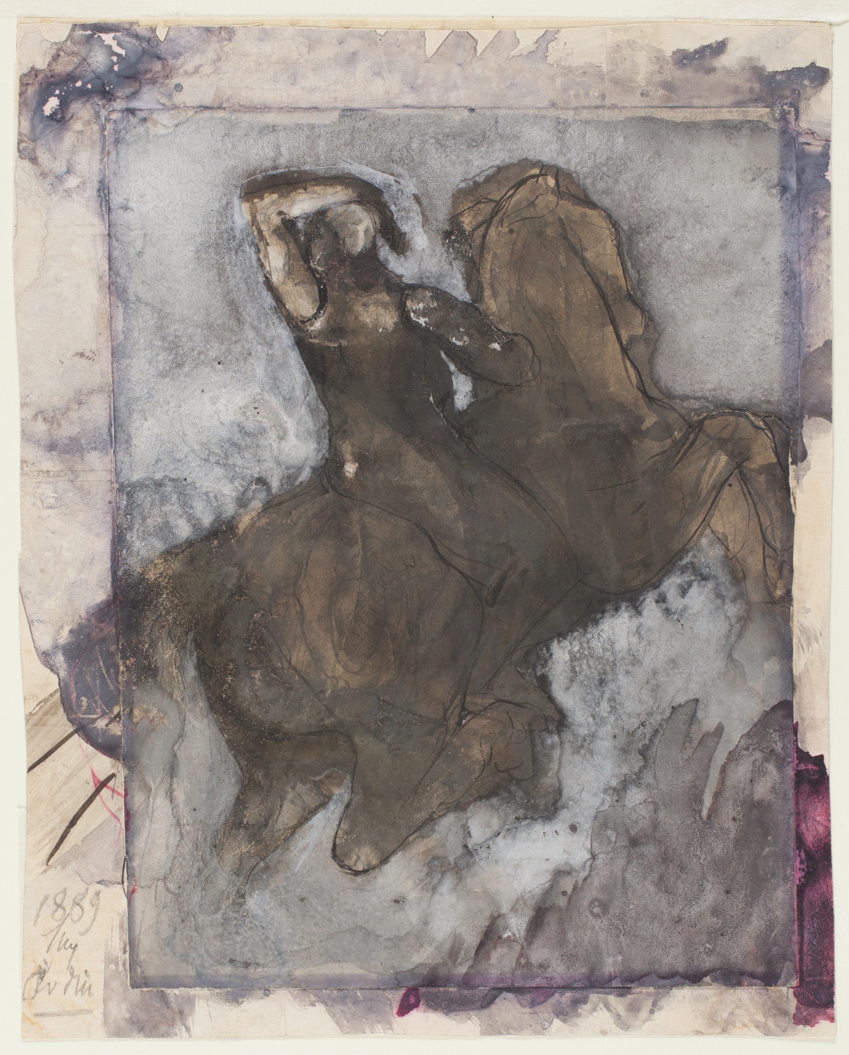 - Gouache, with pen and brown and black ink and traces of magenta ink (faded), over graphite (recto), and graphite (verso) on cream wove paper, tipped onto cream wove paper