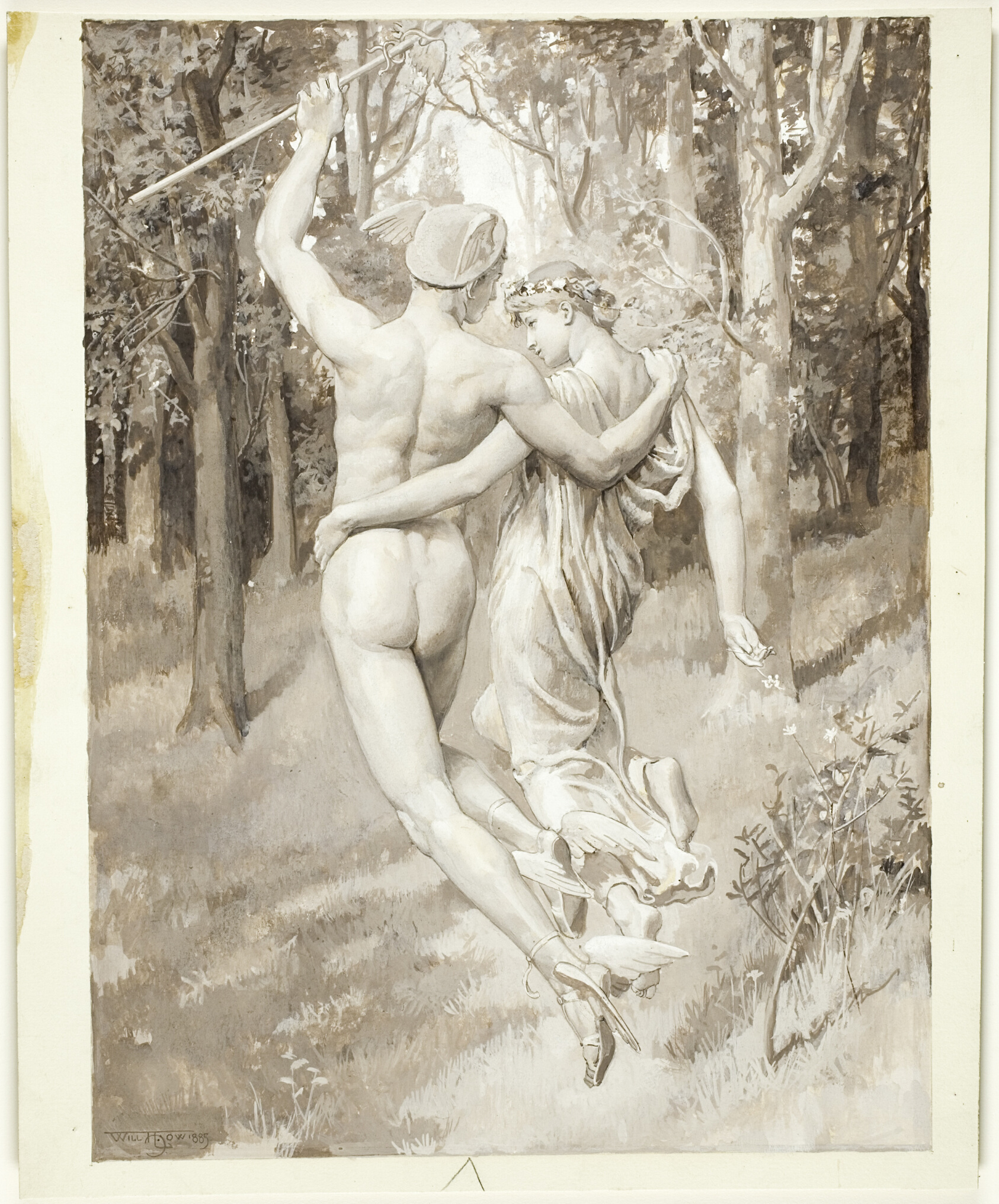 "Into the Green Recessed Woods They Flew" carries the hushed, dream-like quality of a mythological reverie — its pale figures dissolving into shadow, its tones so restrained they feel closer to a memory than a scene. Will Hicock Low trained in Paris under Carolus-Duran during the 1870s, absorbing the French academic tradition before returning to America as one of the defining figures of the American Renaissance. Equally at home with large-scale decorative murals and intimate works like this one, he brought the same classical sensibility to every scale. His gouache pieces on board — including this one, worked in brown and white with touches of black on a warm cream ground — reveal a painter who understood that tonal restraint can carry more emotional weight than a full palette. Low was a close and lifelong friend of Robert Louis Stevenson; the two men corresponded for years and Low illustrated several of Stevenson's published writings, a collaboration that spoke to their shared love of myth, romance, and poetic imagery. Our hand-painted oil reproduction honours Low's careful tonal layering and atmospheric delicacy, translating the quiet enchantment of the original into the warmth and permanence of oil on canvas.