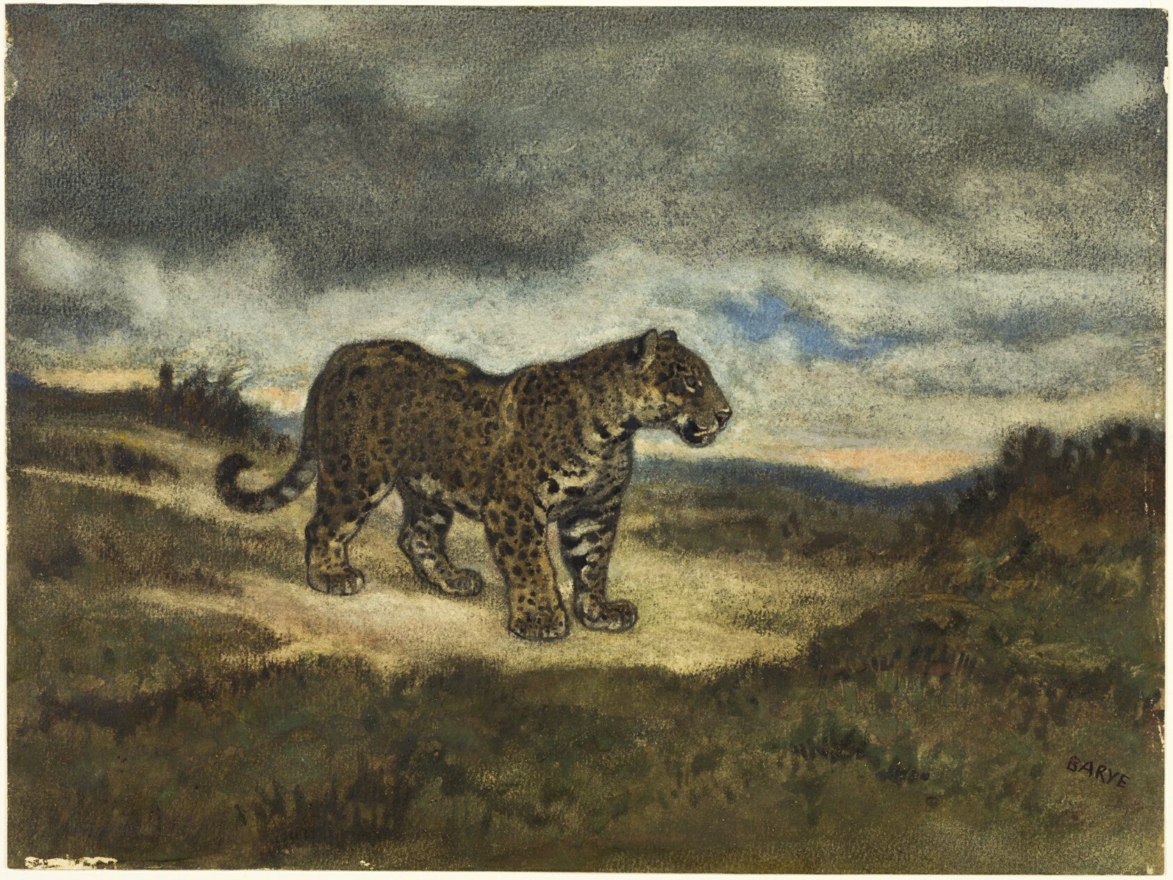 Barye's *Jaguar Standing* radiates a coiled stillness — the animal caught in a moment of alert calm, every muscle suggesting latent power beneath the surface. Antoine-Louis Barye was the foremost animal sculptor of nineteenth-century France, but his works on paper reveal an equally commanding draughtsman. This piece layers watercolor washes with black crayon and restrained touches of gouache, using wiping techniques to lift highlights and suggest the jaguar's dappled coat with remarkable economy. Where academic painters of the period rendered animals as props or symbols, Barye treated them as his primary subjects — worthy of the same rigorous study he gave human anatomy. Barye was a regular presence at the Jardin des Plantes in Paris, making exhaustive observational sketches of the big cats there, and it is widely documented that he also studied dissected specimens to understand musculature from the inside out. That anatomical knowledge is evident here in the precise weight and balance of the stance. The hand-painted oil reproduction translates the quiet authority of the original into a medium that brings new warmth and depth to Barye's composition, honoring both the creature he observed so carefully and the mastery with which he recorded it.