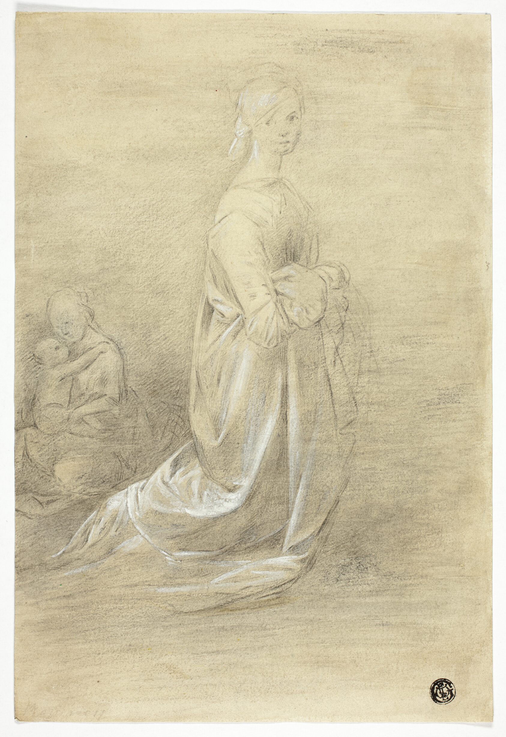 - Black chalk, heightened with white gouache, over brush and gray wash, on cream wove paper