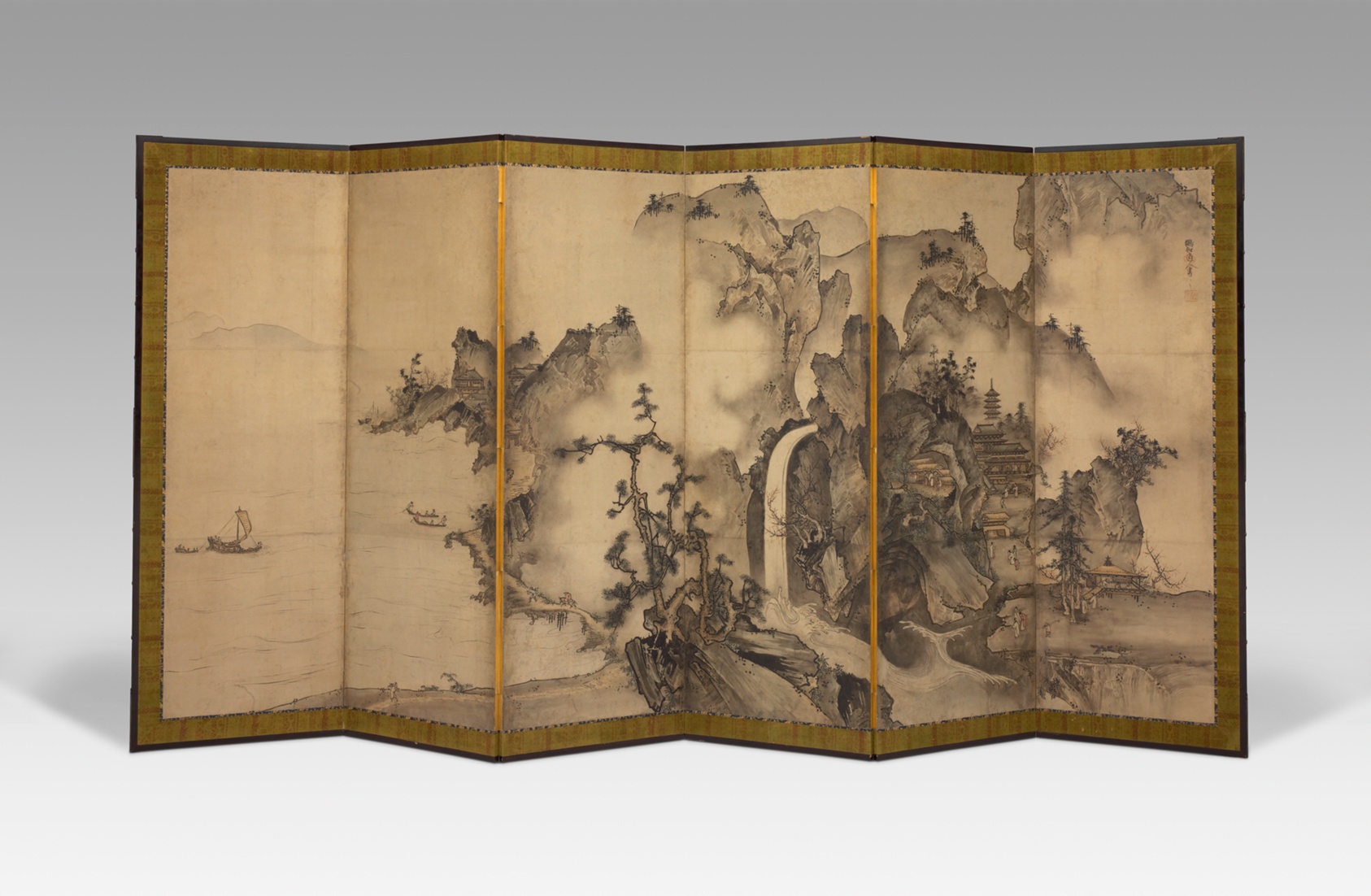 Sesson Shukei's pair of six-fold screens unfolds as a sweeping, season-by-season journey through a mountainous landscape — intimate in detail yet monumental in scope. Shukei was a self-taught Zen monk-painter who spent much of his life in Japan's remote eastern provinces, far from the cultural centers where his contemporaries worked. He absorbed the tradition of the great Sesshū Tōyō without ever studying under him directly, developing an ink style that is more angular and restless than his predecessors — rocks feel hewn, trees seem to twist against the wind, and open mist creates a charged stillness. Working in ink with only restrained passages of color, he coaxed extraordinary tonal range from a near-monochrome palette. It is well-documented that Shukei lived and worked into his eighties or nineties, an exceptional lifespan for the period, and scholars note that his late works show no decline in vitality — if anything, the brushwork grew bolder. This hand-painted oil reproduction translates Shukei's ink rhythms into the richer tonal warmth of oil on canvas, preserving the expressive weight of each brushstroke while bringing the work's quiet drama into a format that holds its own on any wall.