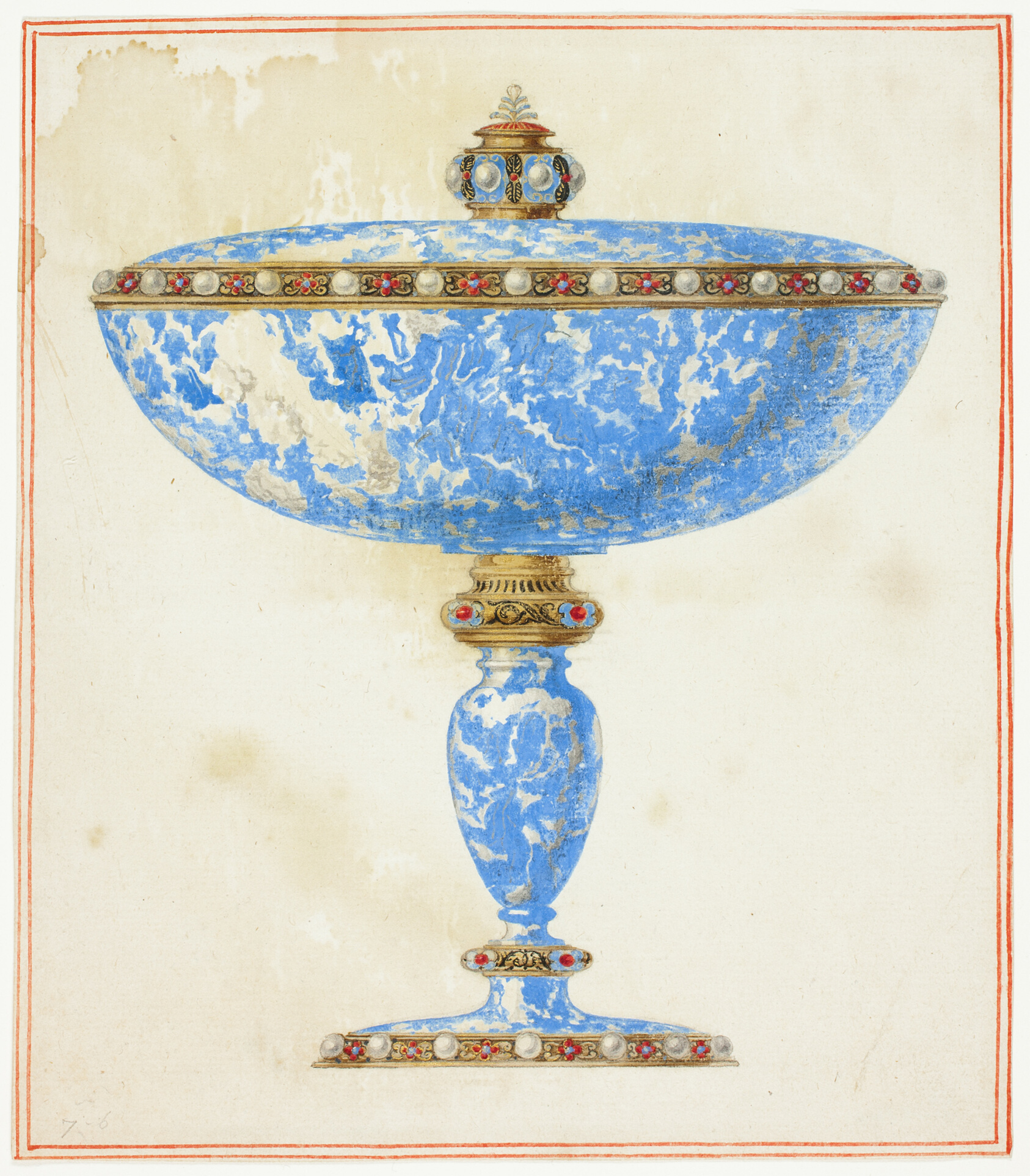 *Lapis Covered Dish on Stand* is a study in quiet opulence — a single decorative object rendered with the precision and sensitivity usually reserved for portraiture. Giuseppe Grisoni (1699–1769) was a Brussels-born painter who spent much of his career moving between England and Italy, absorbing influences from both court portraiture and continental decorative traditions. This work sits outside his usual output of formal likenesses, showing instead a draftsman's eye turned toward the material world. Working in gouache over black chalk on ivory laid paper, Grisoni built up the deep blue of the lapis lazuli with layered washes, then touched in gold to catch the gilded fittings — a technique that gives the piece a luminous, almost jewel-like quality. The work is held in the collection of the Art Institute of Chicago, which preserves a number of drawings that document eighteenth-century European decorative objects with this level of care and craftsmanship. Our hand-painted oil reproduction translates Grisoni's restrained elegance onto canvas, preserving the cool brilliance of the lapis blue, the warmth of the gold accents, and the composed stillness that makes this small work feel so considered — a faithful tribute to an artist who found beauty in the well-made object.