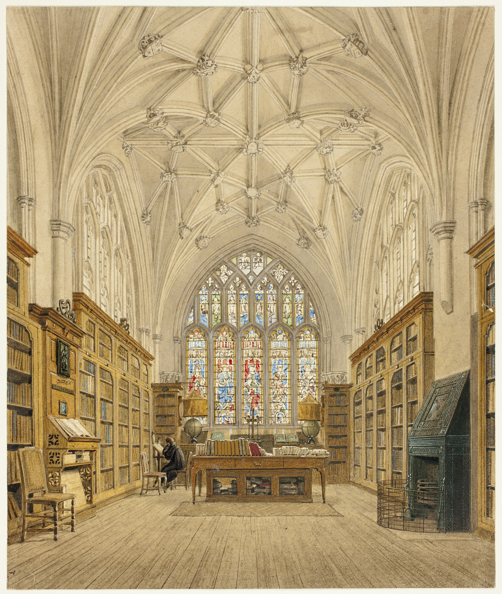 Frederick MacKenzie's view of the Winchester College Library captures the quiet grandeur of one of England's oldest scholastic interiors with a delicacy that feels almost reverential. MacKenzie was among the foremost architectural watercolorists of the early nineteenth century, celebrated for his ability to render Gothic stonework, timber vaulting, and the particular quality of light filtering through leaded windows. Working in watercolor heightened with white gouache over a graphite underdrawing, he built up the scene with patient layering — the gouache giving solidity to carved details while preserving the luminous warmth of the paper beneath. His work appeared widely in the illustrated topographical books that fed the Regency era's appetite for Britain's medieval heritage, and he brought the same rigorous draughtsmanship to his exhibition pieces as to his published engravings. Winchester College, founded in 1382 by Bishop William of Wykeham, holds one of the longest continuous histories of any school in England, and MacKenzie's depiction was made at a moment when scholarly interest in medieval architecture was beginning to reshape British taste toward what would become the Gothic Revival. This hand-painted oil reproduction translates MacKenzie's fine watercolor sensibility into a medium with physical presence — the depth of tone and textural richness of oil paint lending the composition an intimacy that suits the contemplative character of the original.