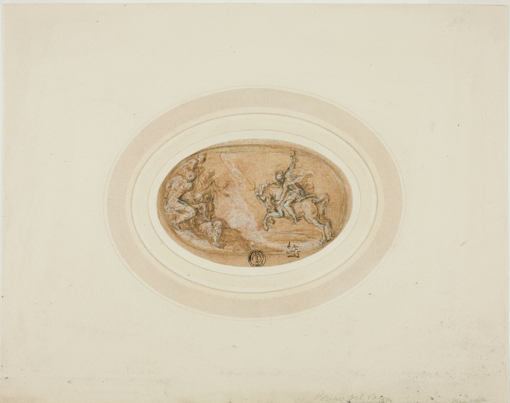 - Pen and brown ink with brush and brown wash, heightened with white gouache, with traces of black chalk, on oval-shaped tan laid paper, edge mounted on tan wove paper, laid down on ivory wove card