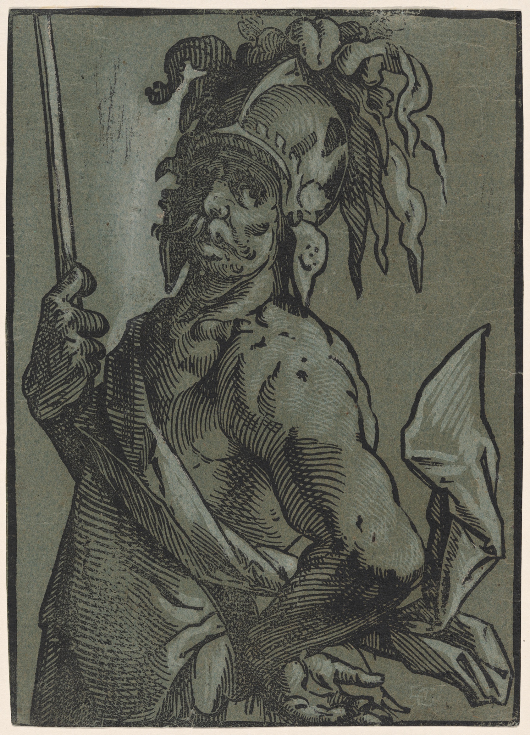 Goltzius's *Mars* is a tour de force of chiaroscuro printmaking — a muscular, armour-clad war god rendered with a drama that feels closer to painting than to print. Hendrick Goltzius was the most technically gifted printmaker of the Dutch Golden Age, working from his studio in Haarlem at a moment when the Netherlands was defining European printmaking. This woodcut belongs to a series depicting the planetary gods, and its method is as striking as its subject: black ink and white gouache work against the blue paper to create three distinct tonal registers, giving the figure a sculptural, almost glowing presence that no two-colour print should be able to achieve. The composition draws on Mannerist influences Goltzius absorbed from Italian masters, filtered through his own theatrical instinct for light and mass. What makes this work widely noted among print historians is that Goltzius completed it despite a severe burn injury to his right hand suffered in childhood — the hand he used to draw and engrave with extraordinary finesse throughout his career. The hand-painted oil reproduction translates that interplay of shadow, mid-tone, and highlight into the richness of oil on canvas, preserving the commanding presence of the original while bringing warmth and depth that only paint can provide.
