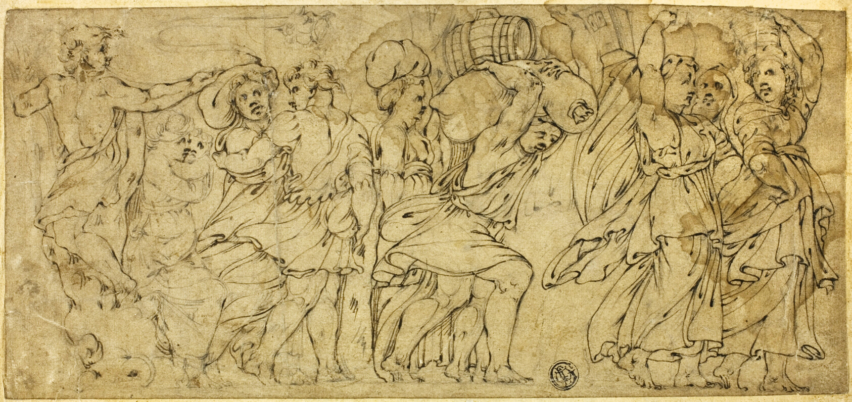 There is a restless energy to this drawing by Polidoro da Caravaggio — figures bent under the weight of barrels and bundles, rendered with a vitality that feels almost sculptural. Polidoro (c. 1499–1543) began his career as a hod-carrier on the construction of the Vatican Loggia, where he caught the attention of Raphael's workshop and absorbed the master's influence firsthand. He went on to become one of Rome's most admired painters of palace façades, covering them in monochrome scenes of ancient processions and mythological figures drawn from classical relief sculpture. His drawings are especially prized for the way they condense that same monumental quality into pure line — black chalk laying the structure, brown ink building the form, white gouache coaxing light from the buff surface. After the Sack of Rome in 1527 scattered Raphael's circle across Italy, Polidoro fled to Messina, Sicily, where he worked until his murder around 1543 — a violent end to one of the Renaissance's most restlessly inventive careers. The hand-painted oil reproduction translates the layered warmth of his ink and chalk into a medium that gives the composition a tangible, enduring presence on any wall.