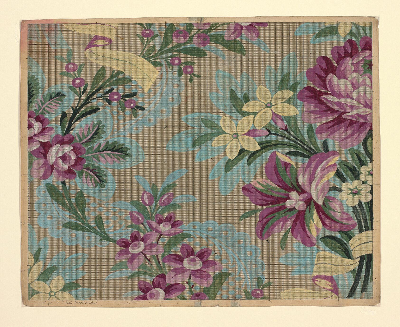 This delicate sheet of ink and gouache on hand-drawn graph paper is at once a functional workshop document and an accidental work of art — a weaving draft that has outlasted the silk it was made to produce. Germain Frères were active in the Lyon silk trade during the latter half of the eighteenth century, a period when France dominated European luxury fabric production. A mise-en-carte was the critical bridge between a designer's pattern and the loom: each coloured square on the graph paper instructed a weaver exactly which warp threads to raise, translating visual imagination into physical cloth. The precision required was extraordinary, and the finest mise-en-cartes were treated almost like proprietary blueprints, closely guarded within workshops. The Lyon silk industry's reliance on these point-paper drafts directly influenced the development of the Jacquard loom in the early nineteenth century, whose punched-card mechanism mechanised the logic these drawings encoded by hand. Our hand-painted oil reproduction honours the meticulous geometry of the original — the measured grid, the layered gouache colours, and the quiet confidence of a craftsman's hand — bringing the intimate scale and working beauty of this eighteenth-century document into your home.