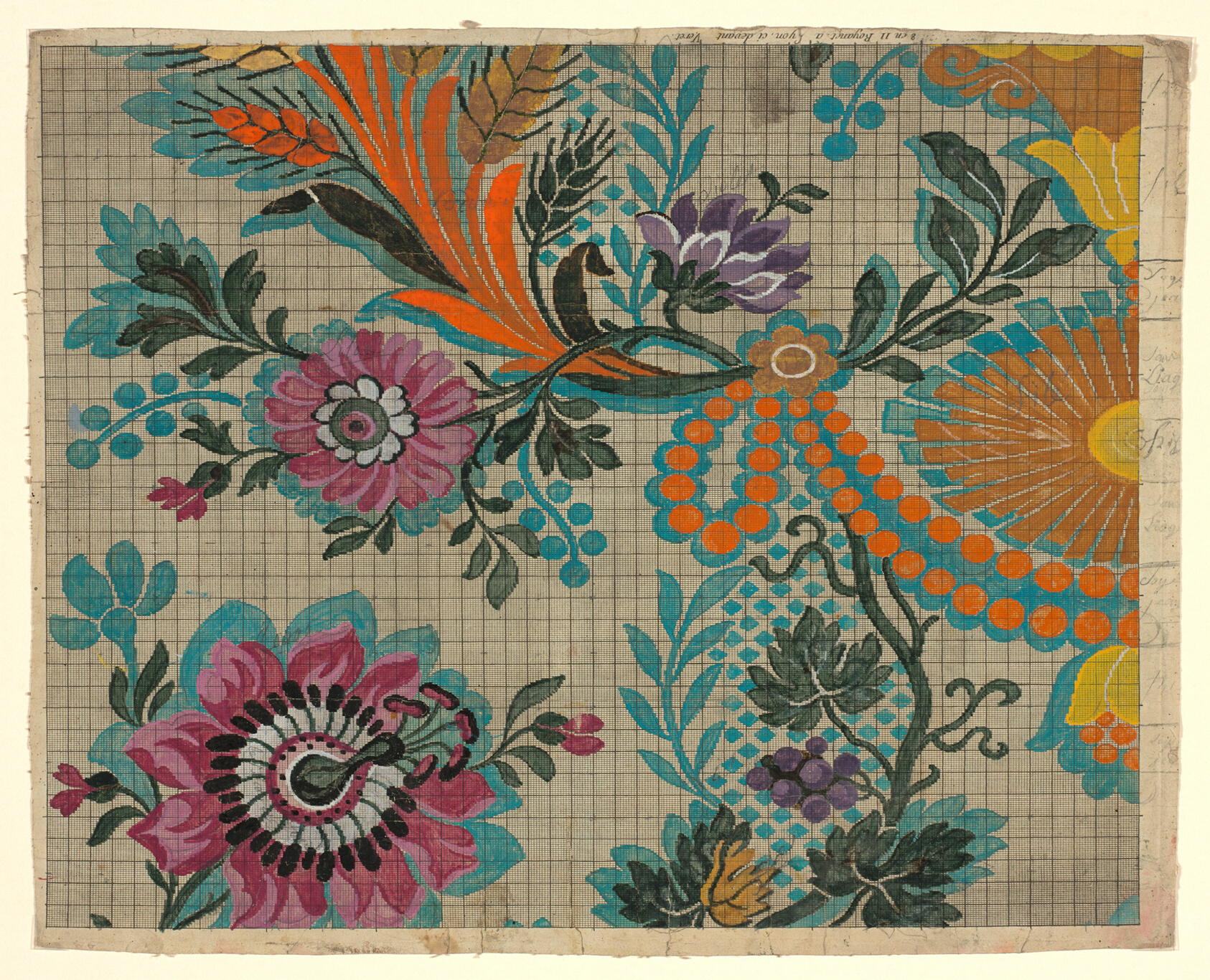 Mise-en-carte (Point-paper) is a textile design document that transcends its functional origins — a grid of ink and gouache laid out with such precision and colour that it reads as a work of art in its own right. Produced in France between 1760 and 1790, this work belongs to a tradition of point-paper design — the method by which silk weavers translated decorative patterns into instructions for the loom. Each coloured square on the hand-drawn graph corresponds to a single thread intersection, meaning the designer was encoding a finished textile before a single thread was woven. Royannet's composition demonstrates the remarkable skill required to think simultaneously in two registers: the abstract grid and the finished silk it would produce. The Art Institute of Chicago holds a significant collection of these French textile designs, recognising them not merely as industrial artefacts but as documents of eighteenth-century decorative taste at its most refined. Our hand-painted oil reproduction translates this intricate layering of colour and structure onto canvas, preserving the delicate interplay between the geometric grid and the organic pattern it carries — a fitting medium for a work that was always, at its heart, about the meeting of system and beauty.