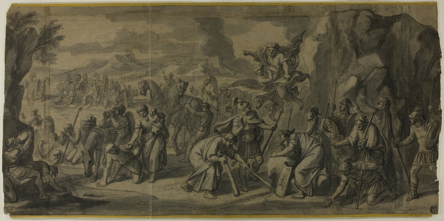 Moses Striking the Rock captures one of the Old Testament's most dramatic interventions — the moment water flows from stone at the touch of a staff — rendered here by François Verdier with the sweeping authority of the French Grand Manner. Verdier trained under Charles Le Brun at the height of Louis XIV's cultural ambitions, absorbing the Academy's taste for monumental figure groupings and rhetorical gesture. This preparatory drawing reveals his working method in rare detail: layers of black ink, crayon, and wash build atmosphere and shadow, while traces of white gouache lift the composition's key figures into light. The result has the tonal richness of a grisaille painting rather than a simple sketch. Verdier was a full member of the Académie royale de peinture et de sculpture, elected in 1678, and contributed designs to several of the major decorative programmes of his era — making works like this an intimate window into how large-scale religious compositions were conceived before they reached the wall. The hand-painted oil reproduction translates Verdier's careful orchestration of light and crowd into the depth and warmth that only oil on canvas can sustain, giving the scene a physical presence the original drawing — precise and beautiful as it is — was never intended to carry alone.