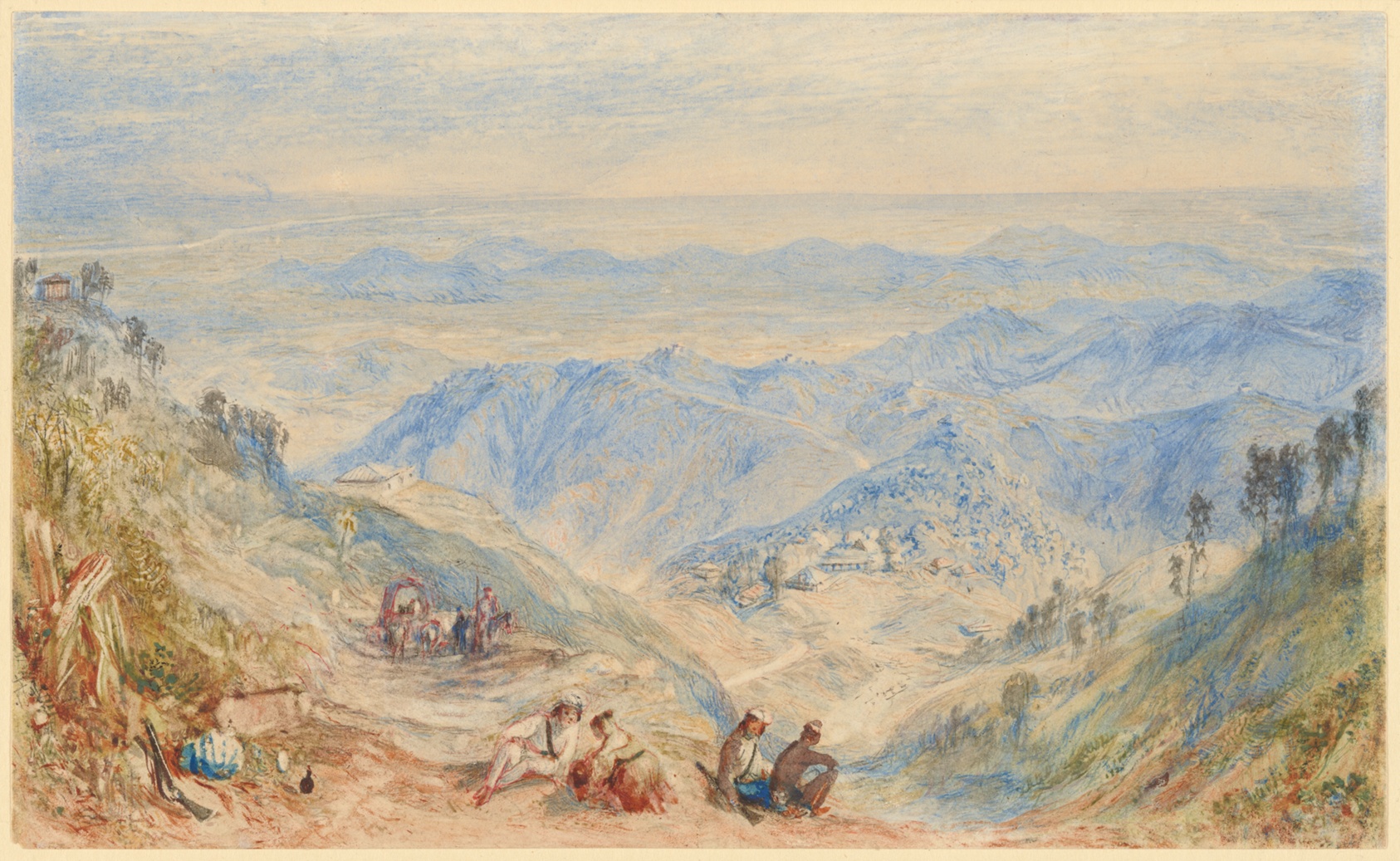 Turner's luminous depiction of the Mussoorie hill station and the Doon Valley below captures the layered atmosphere of the Indian foothills with a delicacy that feels almost aerial — distance dissolved into light. Turner never set foot in India. This work, like several of his Indian subjects from the 1830s, was produced in London from sketches and descriptions supplied by travellers and officers returning from the subcontinent. That remove from the subject only seemed to sharpen his instinct for atmosphere: working in watercolor and gouache over a graphite underdrawing, he built up the scene through translucent washes and selective touches of opaque white, conjuring haze and altitude rather than topographical precision. It is less a record of a place than a meditation on light caught between mountain and plain. Turner was famously protective of his watercolors and reluctant to part with the finest of them, keeping many for his own reference and study throughout his career — a testament to how seriously he regarded the medium alongside his oils. Our hand-painted oil reproduction translates the soft luminosity of the original into a medium built for permanence, preserving Turner's atmospheric sweep and tonal subtlety on canvas you can live with for generations.