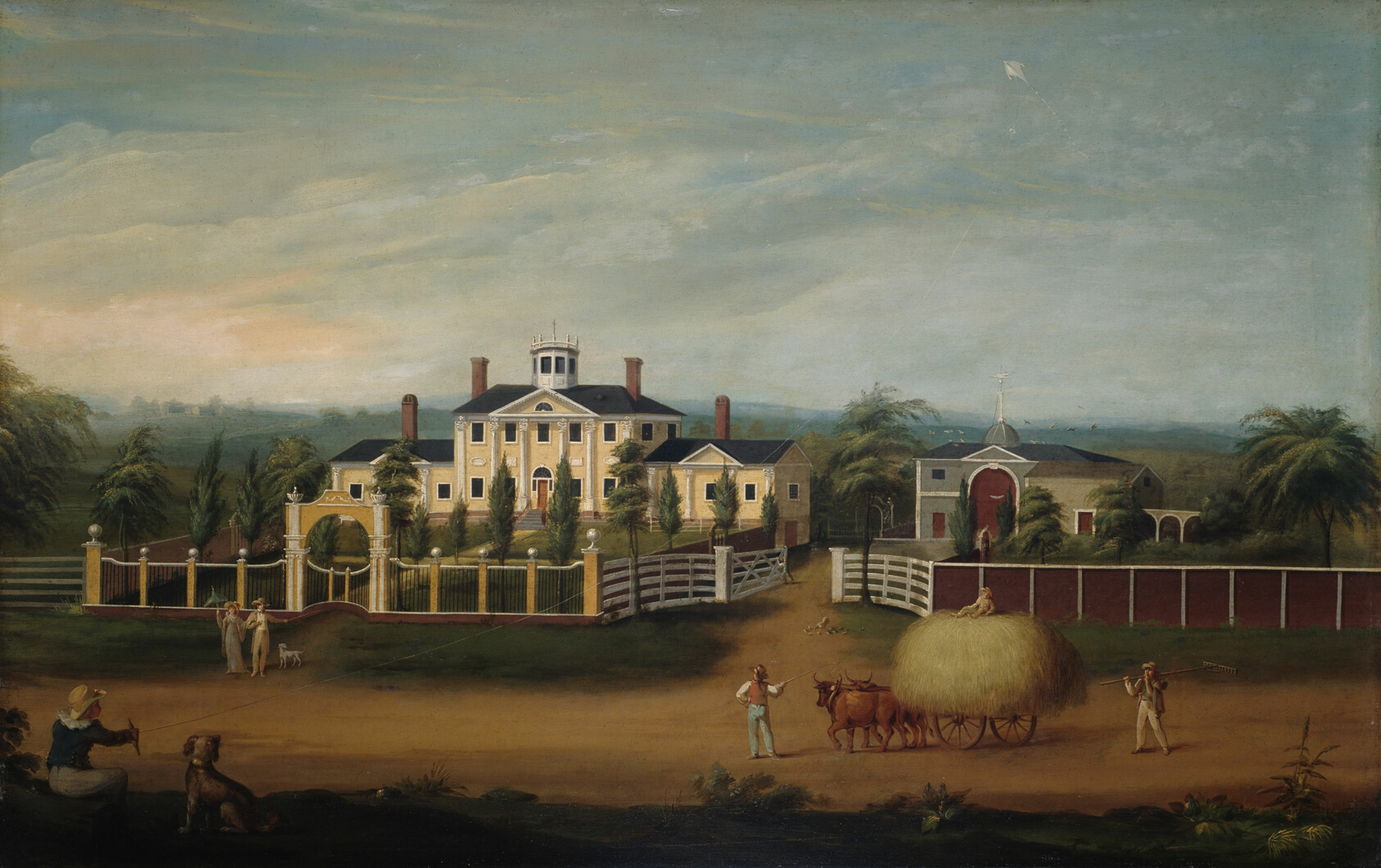 *New England Country Seat* offers a quietly composed view of early American prosperity — a grand estate set within an ordered landscape that speaks to the aspirations and aesthetic sensibility of the Federal period. Painted by an unidentified artist between 1800 and 1820, the work belongs to a tradition of American folk painting in which skilled but formally untrained hands produced remarkably refined images of domestic life and property. The choice of yellow poplar panel as a support was practical and common among early American painters, lending the surface a fine-grained stability well-suited to detailed, controlled brushwork. What distinguishes this piece is the painter's ability to balance architectural precision with a warmth that keeps the scene from feeling stiff or purely documentary. The painting has been held in the collection of the Art Institute of Chicago, where it stands as an example of how anonymous American artists shaped a distinct visual identity for the young nation — independent of European academies and all the more compelling for it. Our hand-painted oil reproduction is made to order on quality canvas, matching the original's tonal palette and compositional calm, so that the same unhurried dignity of early American country life translates faithfully from the museum wall to yours.