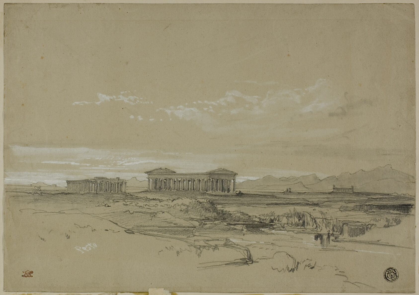 Pesto — almost certainly a study of ancient Paestum's Greek temples in southern Italy — distills a grand subject into something intimate and still, built from graphite lines and quiet washes of gray. William Leighton Leitch was among the most respected drawing masters of Victorian Britain, appointed tutor to Queen Victoria and the royal family in 1846, a position he held for nearly four decades. His Italian travels were the engine of his finest work, and this sheet shows exactly why: working in graphite with touches of brush and gray wash heightened by white gouache, he creates depth and atmosphere with remarkable economy. There is none of the theatrical drama that other artists brought to the ruins of the classical world — just light, shadow, and a steady, observant hand. Leitch's royal appointment is one of the best-documented facts of his career, reflecting the authority his understated style commanded in an age that valued both technical refinement and a certain emotional restraint. The hand-painted oil reproduction honours that restraint, translating the tonal subtlety of Leitch's original into a medium that gives the scene permanence without trading its quiet character for spectacle.
