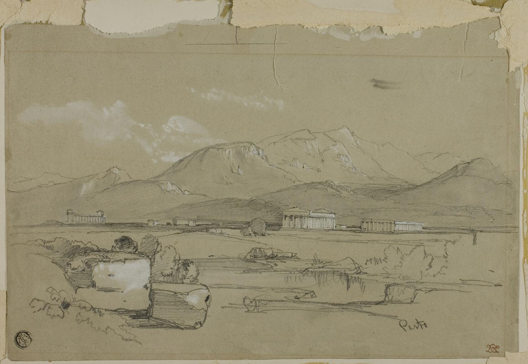 Rendered in the quiet authority of graphite and white gouache, this study of the ancient temples at Paestum captures the ruined grandeur of southern Italy with the restraint of a master draughtsman. William Leighton Leitch was one of the foremost British watercolourists of the Victorian era, celebrated for his Italian landscapes and his ability to render light and atmosphere with delicate precision. His technique here — graphite worked with a stump to create soft tonal gradations, then lifted into luminosity with touches of white gouache on warm-toned paper — demonstrates the sophistication he brought even to preparatory studies. The choice of grayish-tan paper is deliberate, functioning as a mid-tone that anchors both shadow and highlight. Leitch served as drawing master to Queen Victoria and several members of the royal family, a position that speaks to the esteem he commanded among his contemporaries. Translating this work into a hand-painted oil reproduction means re-imagining its tonal subtlety in a richer medium — the delicate push and pull of light that Leitch achieved through stumped graphite finds its equivalent in the layered glazes and careful brushwork of oil, preserving the contemplative stillness that makes the original so quietly affecting.