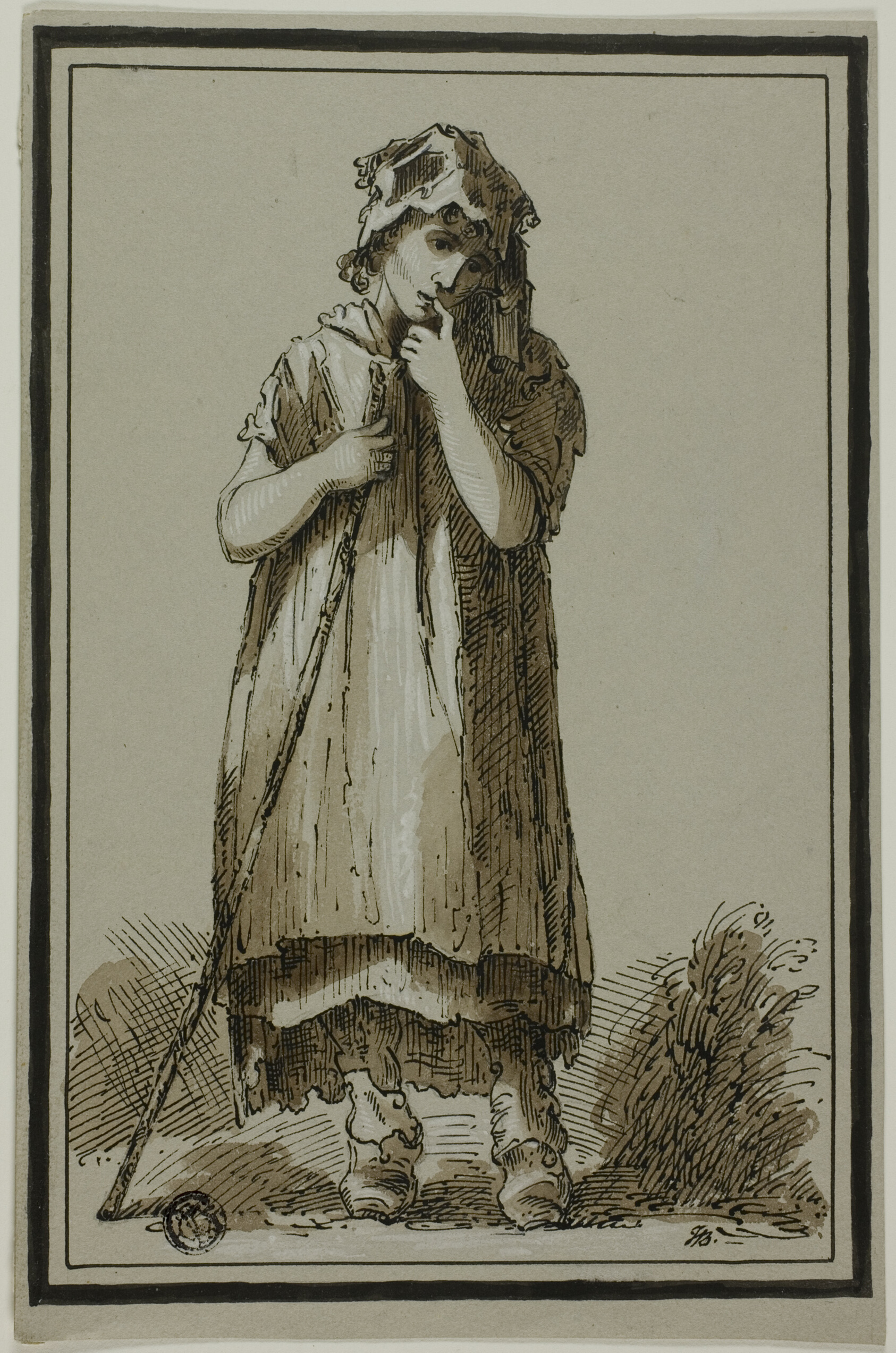 - Pen and black ink, with brush and brown wash, heightened with white gouache, on gray wove paper