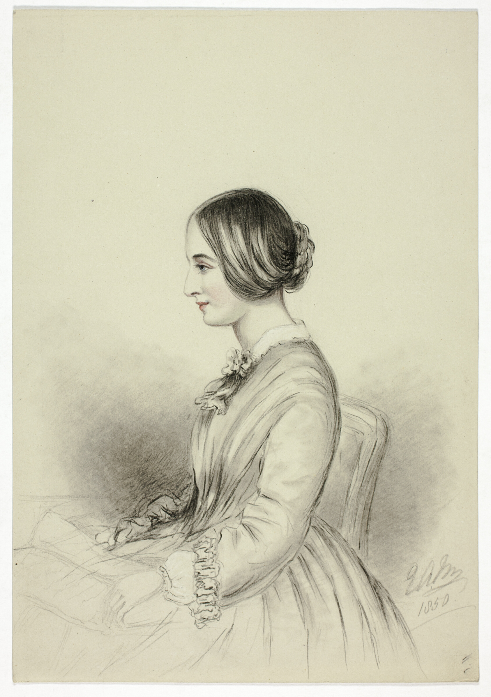 Portrait of Selina (Quin) Markham carries the quiet intimacy of a sitting between two women who trusted each other — the subject's gaze relaxed, the handling assured. Elizabeth Murray was a British artist who built a reputation in the mid-nineteenth century largely outside the conventional routes available to women of her time, exhibiting at the Royal Academy and spending formative years in Morocco and Gibraltar, where she developed a sensitivity to light and human presence that marked her portraiture. This work — drawn in black and colored chalk with traces of white gouache on gray wove paper — demonstrates her fluency in the softer tonal registers of draughtsmanship, where character is built through restraint rather than paint. The gray ground does much of the atmospheric work, with chalk lifted and layered to suggest form without forcing it. Murray was one of the few women of her era to sustain a professional exhibiting career across decades, a fact the Art Institute of Chicago acknowledges in holding her work among its permanent collection. The hand-painted oil reproduction translates Murray's delicate chalk modelling into a medium with greater permanence and presence, preserving the contemplative mood of the original while giving the composition the weight and warmth of oil on canvas.