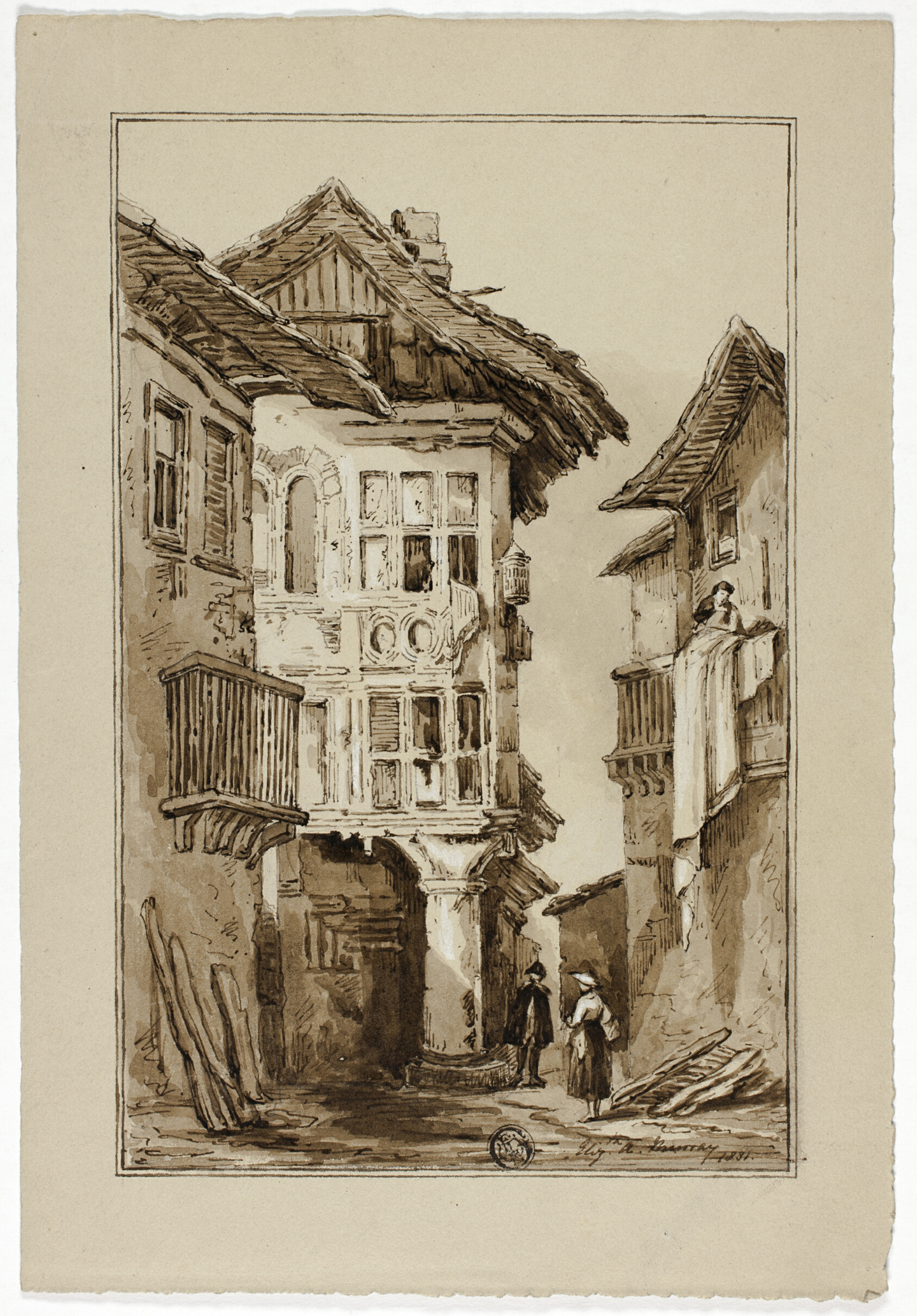 Rustic Street Scene draws the eye into a quiet corner of everyday life, rendered with the kind of unhurried observation that makes a modest subject feel timeless. Elizabeth Murray was a British artist who came of age during an era when women of means were increasingly taking their sketchbooks beyond the parlour and into the wider world. Working in pen and brown ink with washes of the same warm tone, she built scenes through layered mark-making rather than colour, using white gouache to coax light from the surface. The result has an intimacy and spontaneity that finished oil paintings of the period rarely achieved — you sense the artist was present, looking, rather than composing from memory. Murray's work is relatively little-known today, which makes holdings like this one at the Art Institute of Chicago all the more valuable as a record of a skilled and independent eye working in the Romantic tradition. Because the original is a work on paper — delicate, tonal, and held behind glass in a museum — most people will never see it in person. This hand-painted oil reproduction translates Murray's quiet scene into a medium built to last, preserving the warmth of her brown palette and the lived-in feeling of her streetscape for a wall rather than an archive.