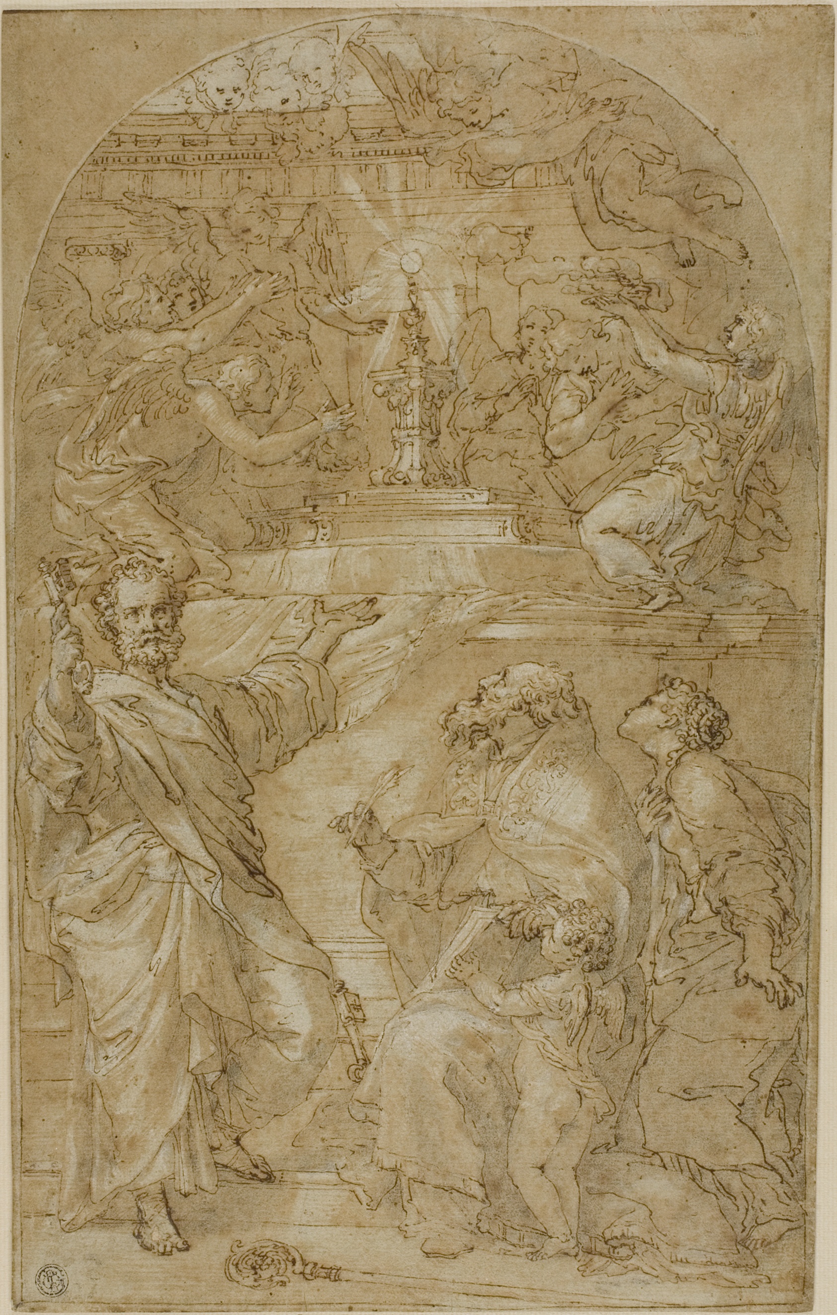 The devotional warmth of this composition — three saints gathered in reverence before the Eucharist — gives it an intimacy that transcends its modest scale. Created by an unidentified hand, the work belongs to a tradition of devotional drawings that flourished in Catholic Europe in the wake of the Counter-Reformation, when the Council of Trent's reaffirmation of transubstantiation sparked a surge in imagery celebrating Eucharistic veneration. The technique is unusually layered: black chalk serves as a structural scaffold, over which pen and brown ink define contour and shadow, a brown wash builds tone across the figures, and white gouache lifts the light on drapery and haloes. The blue-gray laid paper itself becomes part of the palette, providing a cool, contemplative ground against which the composition quietly breathes. The work is held in the permanent collection of the Art Institute of Chicago, one of North America's foremost repositories of Old Master works on paper. Our hand-painted oil reproduction translates this drawing's tonal refinement into the warmth and depth that only oil paint can offer, preserving the delicate interplay of light and shadow that gives the original its sense of hushed, genuine devotion.