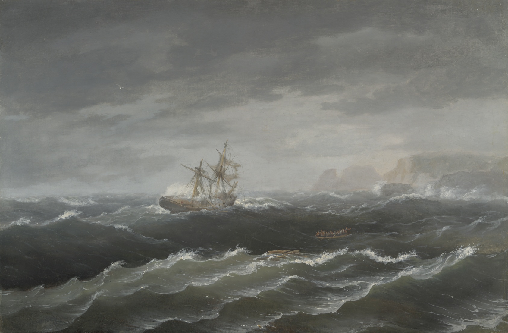 Few American paintings capture the raw terror of the sea with as much immediacy as Thomas Birch's *Shipwreck near a Rocky Coast*, where churning grey-green waves and a stricken hull convey both the power of nature and the fragility of human endeavour. Birch arrived in Philadelphia from England in the 1790s and went on to become one of the earliest and most influential marine painters working in America. Trained initially as an engraver under his father William Russell Birch, he brought a draughtsman's precision to compositions that nonetheless feel urgent and atmospheric. His seascapes are distinguished by carefully observed wave forms and a moody tonal palette drawn from Dutch and English maritime traditions, yet grounded in the American coastal landscape he came to know intimately. Birch's reputation soared after he produced a celebrated series of paintings documenting American naval victories during the War of 1812, establishing him as the foremost chronicler of maritime life in the young republic. This hand-painted oil reproduction faithfully recreates Birch's dramatic contrasts of dark water and pale spume, the tension of his composition, and the layered depth that only oil on canvas can achieve — bringing a museum-held masterwork into a private space without sacrificing any of its force.
