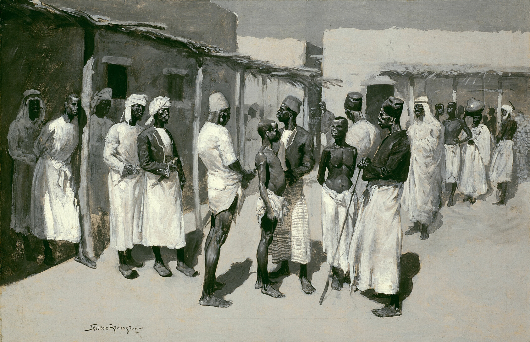 Frederic Remington's *Slave Market* (1893) presents a scene of striking human tension, rendered with the confident brushwork that defined one of America's most gifted narrative painters. Best known for his unflinching portrayals of the American West, Remington brought the same observational rigour to subjects beyond the frontier — his years working as an artist-correspondent sharpened his eye for the charged, unscripted moment. In *Slave Market*, figures are arranged with the compositional authority he carried across oil, watercolour, and bronze, using light and shadow to draw the viewer into the scene rather than simply document it. His palette in this period grew richer and more atmospheric as he moved away from illustration and toward serious fine art painting. Now held in the collection of the Art Institute of Chicago, the work stands as evidence of Remington's range beyond the cavalry charges and cattle drives for which he became famous. Each hand-painted oil reproduction of this work is executed on canvas using traditional materials and techniques, preserving the texture, tonal depth, and emotional weight of the original — a faithful rendering made to last as long as the painting it honours.