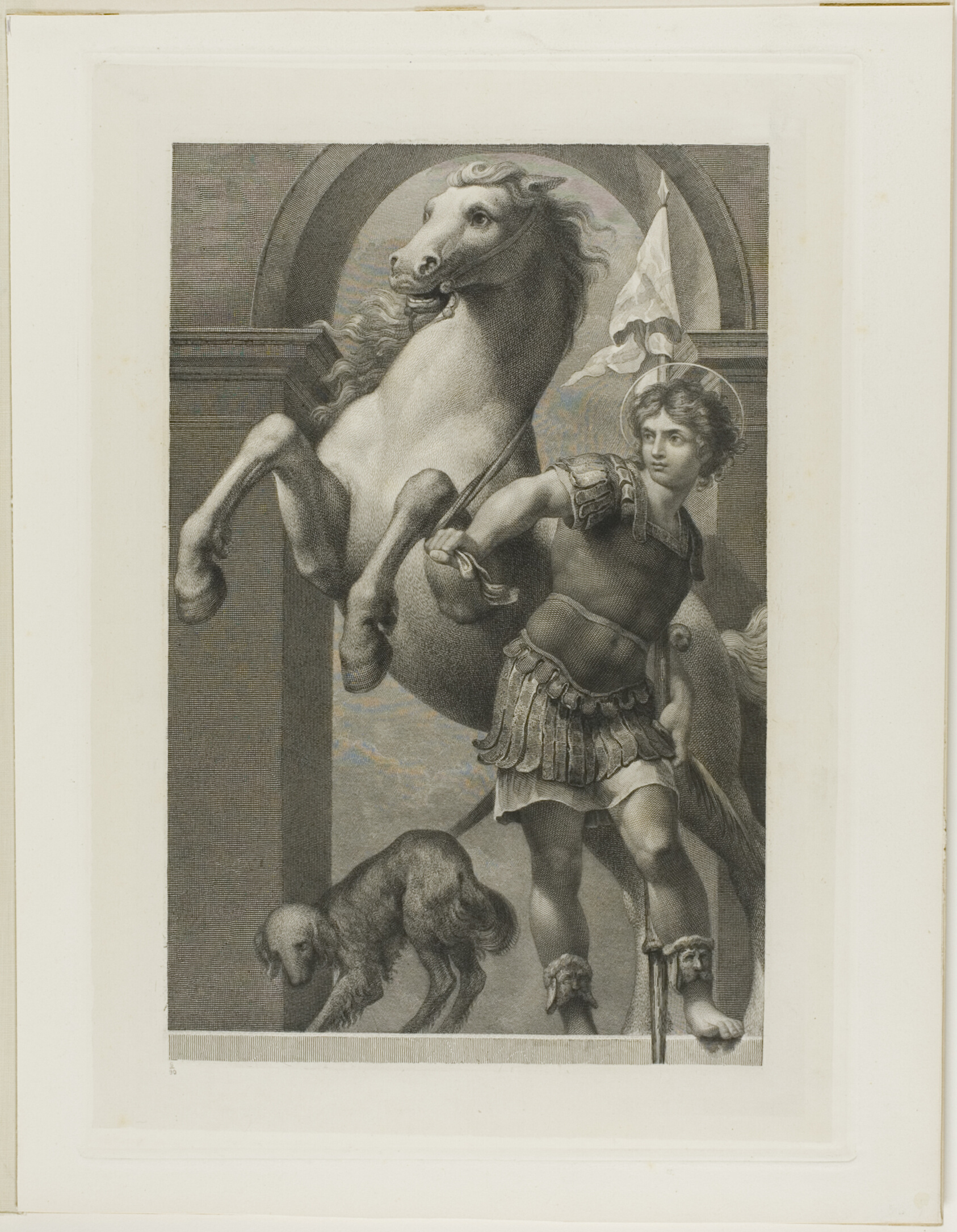 This depiction of St. George captures the saint in the manner of the northern Italian tradition — resolute, dignified, and rooted in the devotional art of the Parma school. Paolo Toschi was one of the most respected figures in early nineteenth-century Italian art, celebrated primarily as an engraver of exceptional refinement who trained in Parma and later in Paris under Luigi Calamatta's circle. He spent much of his career as director of the Parma Academy of Fine Arts, where he championed the legacy of Correggio above all others. His oil works, rarer than his prints, carry the same meticulous attention to surface and tone that made his engravings famous across Europe. Toschi's deep engagement with Correggio — who himself painted a celebrated altarpiece featuring St. George for the church of San Pietro Martire in Modena — likely shaped how he approached this subject, treating the warrior-saint less as a martial figure than as a symbol of spiritual conviction. The hand-painted oil reproduction renders every nuance of Toschi's handling with care: the warmth of the palette, the subtle modelling of light across form, and the quiet gravity that distinguishes his work from more theatrical interpretations of the same subject.