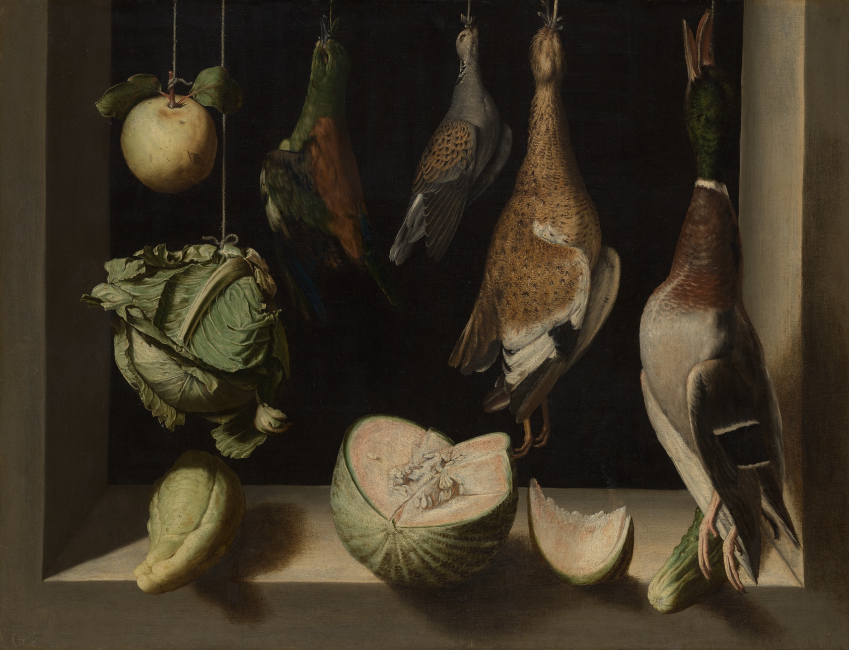 Still Life with Game Fowl stands as one of the most quietly commanding still lifes of the Spanish Golden Age, its suspended birds and stark geometry radiating a strange, meditative intensity. Juan Sánchez Cotán worked in Toledo at a moment when Spanish painters were beginning to treat humble objects with the same seriousness as religious subjects. His signature device — arranging food and game within a stone window opening against an absolute black void — gives each object an almost sculptural presence. The light rakes across feathers and skin with forensic precision, yet the overall effect is far from cold; there is something devotional in the attention he brings to these ordinary things. Cotán entered the Carthusian monastery of El Paular in 1603, shortly after completing the works that would secure his reputation, and scholars have long noted the austere, contemplative quality of his still lifes seems to anticipate that withdrawal from the world. This hand-painted oil reproduction is made to the same scale as the original, working directly from high-resolution reference material so that the tonal relationships — particularly the subtle gradations of shadow that give the composition its depth — are preserved as closely as the medium allows.