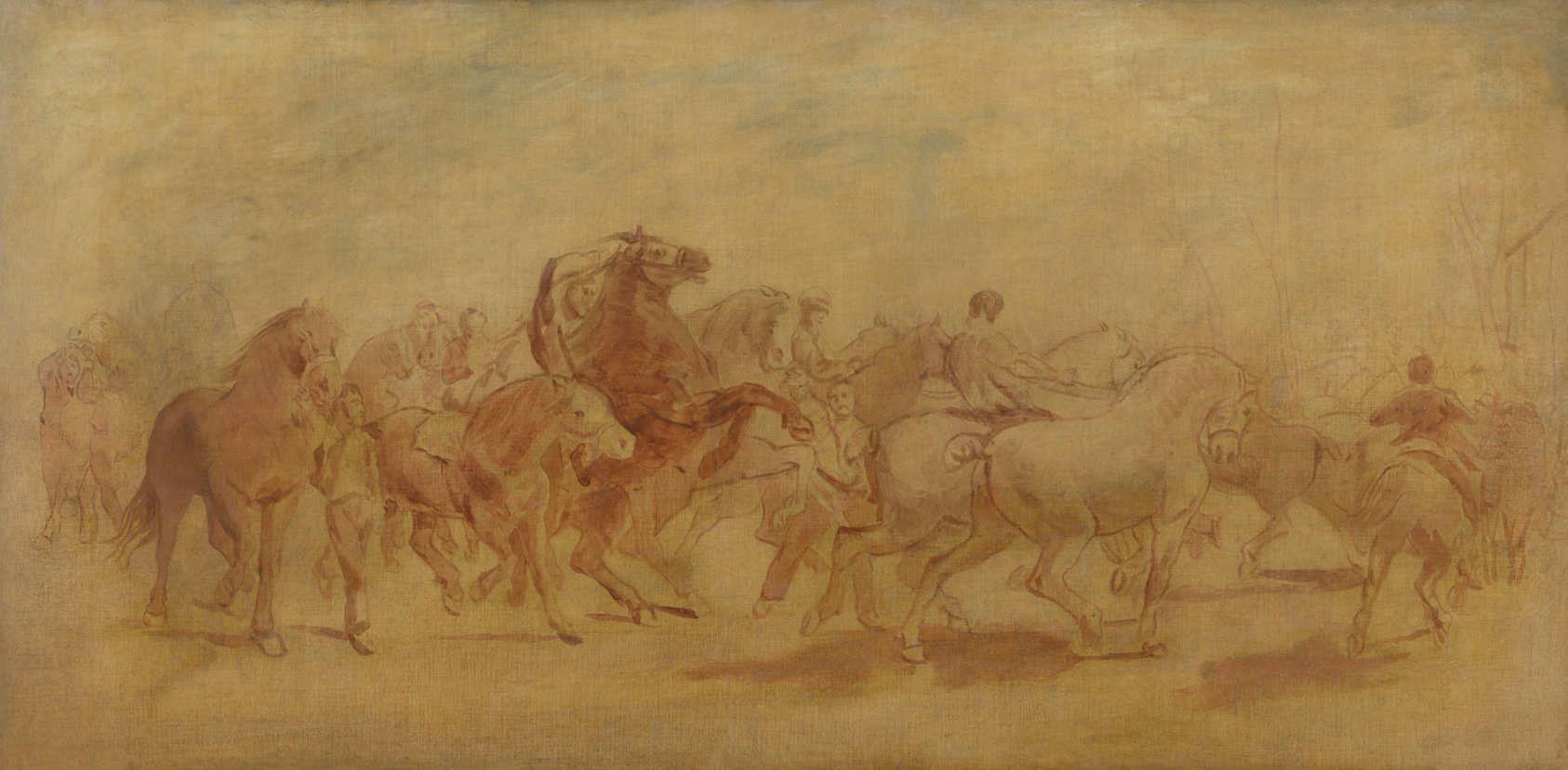 Charged with movement and muscular energy, this preparatory study captures the swirling chaos of the Paris horse market with an immediacy that rivals the finished masterwork it preceded. Rosa Bonheur was among the most celebrated animal painters of the nineteenth century, earning recognition across Europe at a time when the fine arts largely excluded women from serious professional standing. Her approach to painting animals was grounded in direct, sustained observation — she kept a private menagerie and spent years studying horses in motion, anatomy, and temperament. In this study, that deep familiarity is evident in every brushstroke: the tension in haunches, the flare of a nostril, the way handlers lean into the pull of restless animals. To sketch at the Parisian horse fairs, Bonheur obtained a police permit to wear men's clothing — a widely documented practice she renewed regularly to move freely through the working-class crowds without drawing attention. The finished Horse Fair became one of the most famous paintings of its era. This study, held in the Art Institute of Chicago, offers something more intimate: the artist thinking through the problem in real time, before the scale and spectacle took over. A hand-painted oil reproduction on canvas preserves that directness — the layered paint, the loose confident marks, the sense of controlled urgency that no print can fully convey.