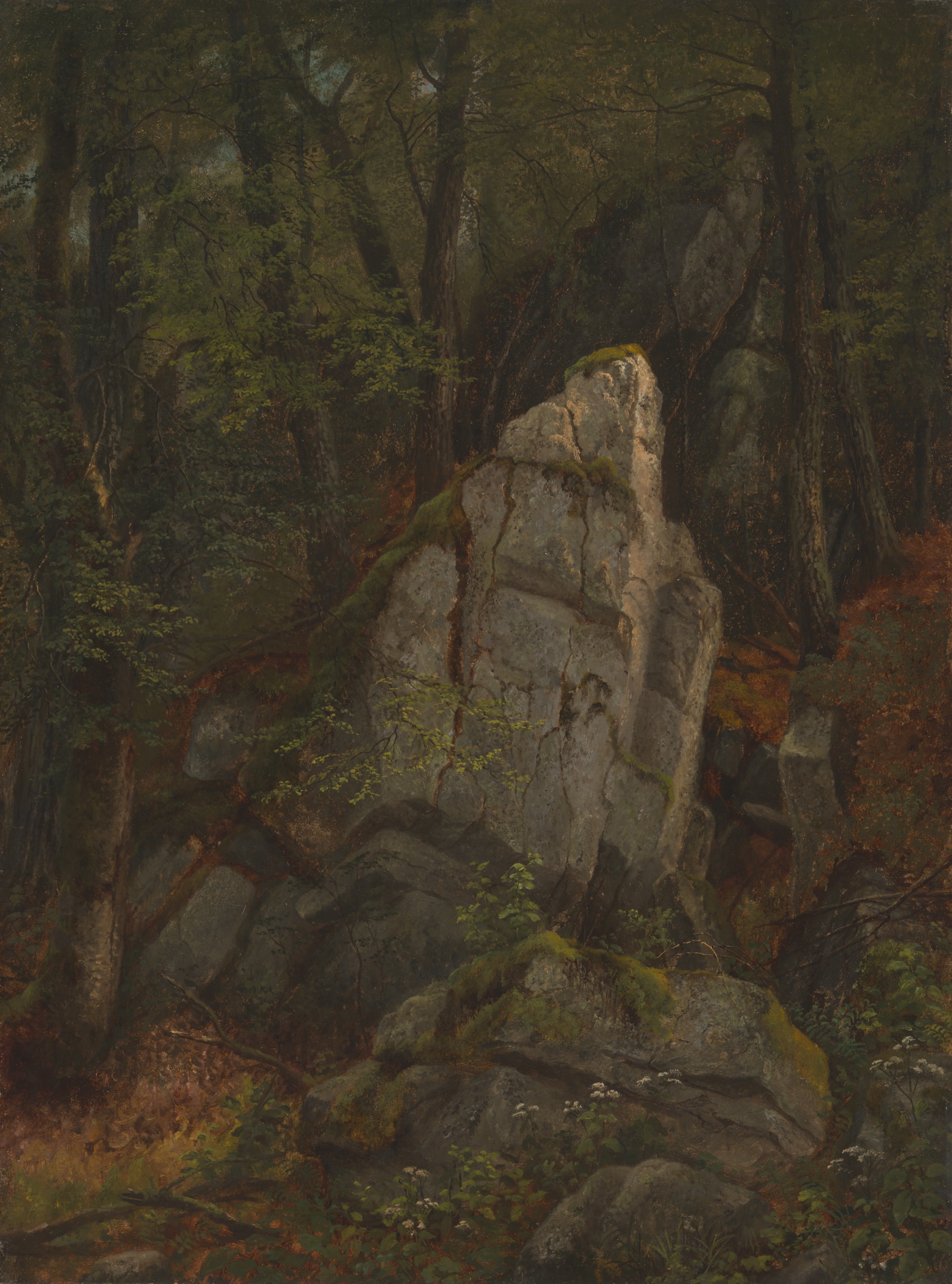 Study of Rocks in Pearson's Ravine is one of Asher Brown Durand's most intimate encounters with the American landscape — a close, unhurried examination of moss-covered stone, damp earth, and the quiet drama of light filtering through a wooded hollow. Durand was among the founding figures of the Hudson River School, but where his contemporaries often painted sweeping panoramas, he was drawn to the particular. In the 1850s he developed a habit of working directly in the field, painting small studies from life that captured texture and atmosphere with a directness unusual for the period. His rocks feel weighty and real — you sense the moisture in them, the years of weathering — because he observed them that way, crouched in the actual ravine rather than reconstructing the scene in a studio. Durand published his influential "Letters on Landscape Painting" in 1855, urging fellow artists to go directly to nature rather than rely on convention or imagination — a philosophy evident in every brushstroke of this study. Our hand-painted oil reproduction is rendered on canvas by skilled artists working from high-resolution archival references, preserving the earthy palette, the subtle modelling of the stone surfaces, and the quiet intimacy that makes the original so compelling.